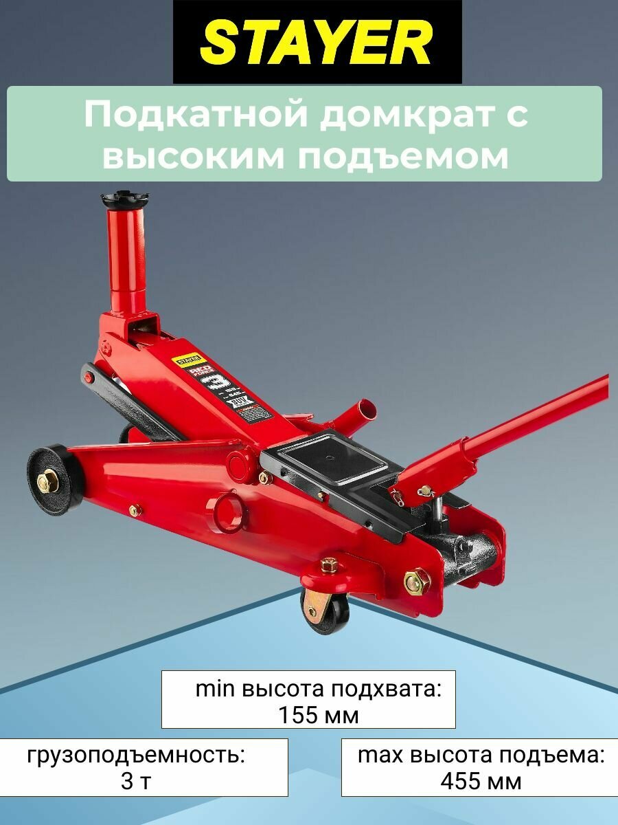 Гидравлический подкатной домкрат для внедорожников STAYER 3т, 155-545мм 43157-3