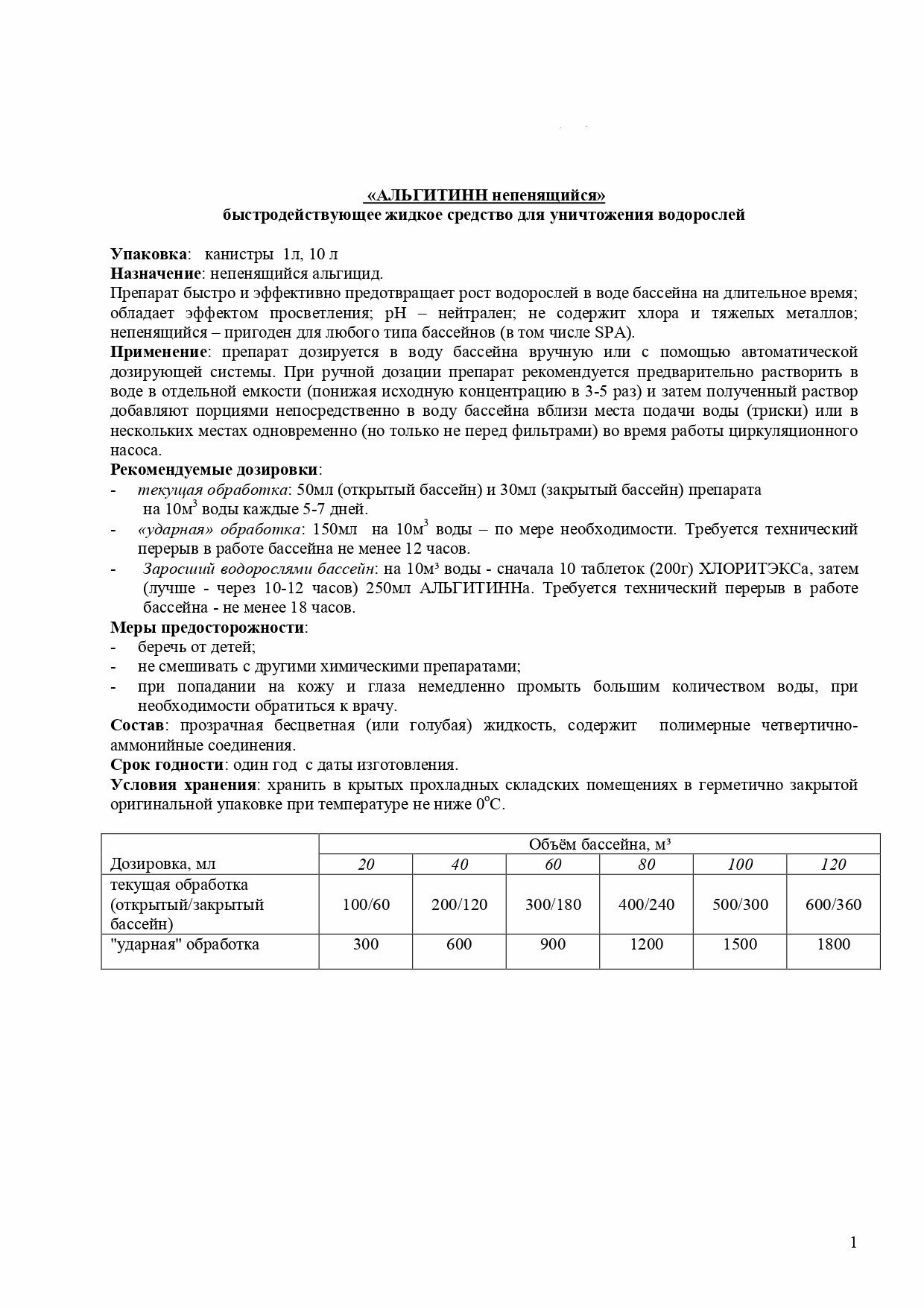Жидкое средство для обработки плавательных бассейнов альгитинн (предотвращает рост водорослей), 1л.