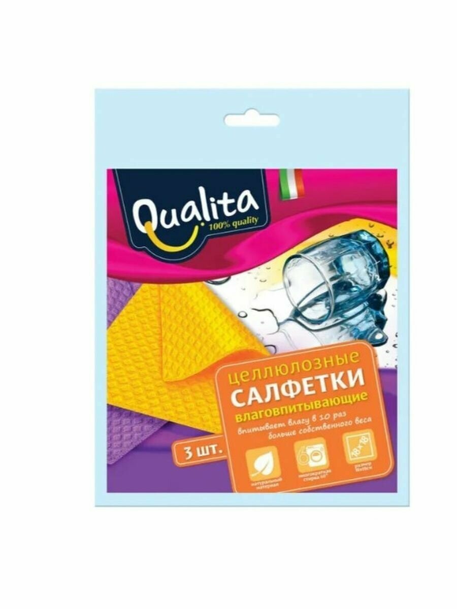 Салфетки для уборки Qualita целлюлозные влаговпитывающие, 3 шт, желтый/зеленый/розовый
