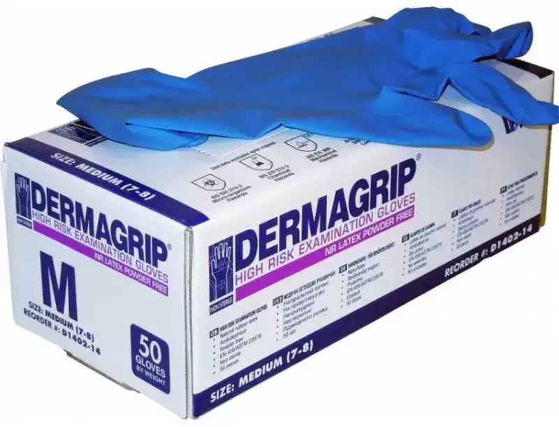 DERMAGRIP Перчатки латексные неопудренные High Risk, смотровые, нестерильные, текстурированные, размер M, 30 гр, 50 шт/уп (25 пар), цвет голубой