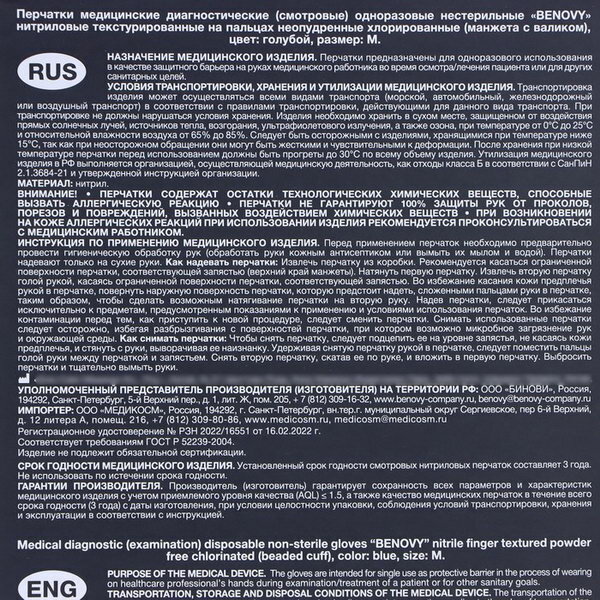 Benovy Перчатки одноразовые нестерильные нитриловые текстурированные на пальцах голубого цвета, 50пар, размер M