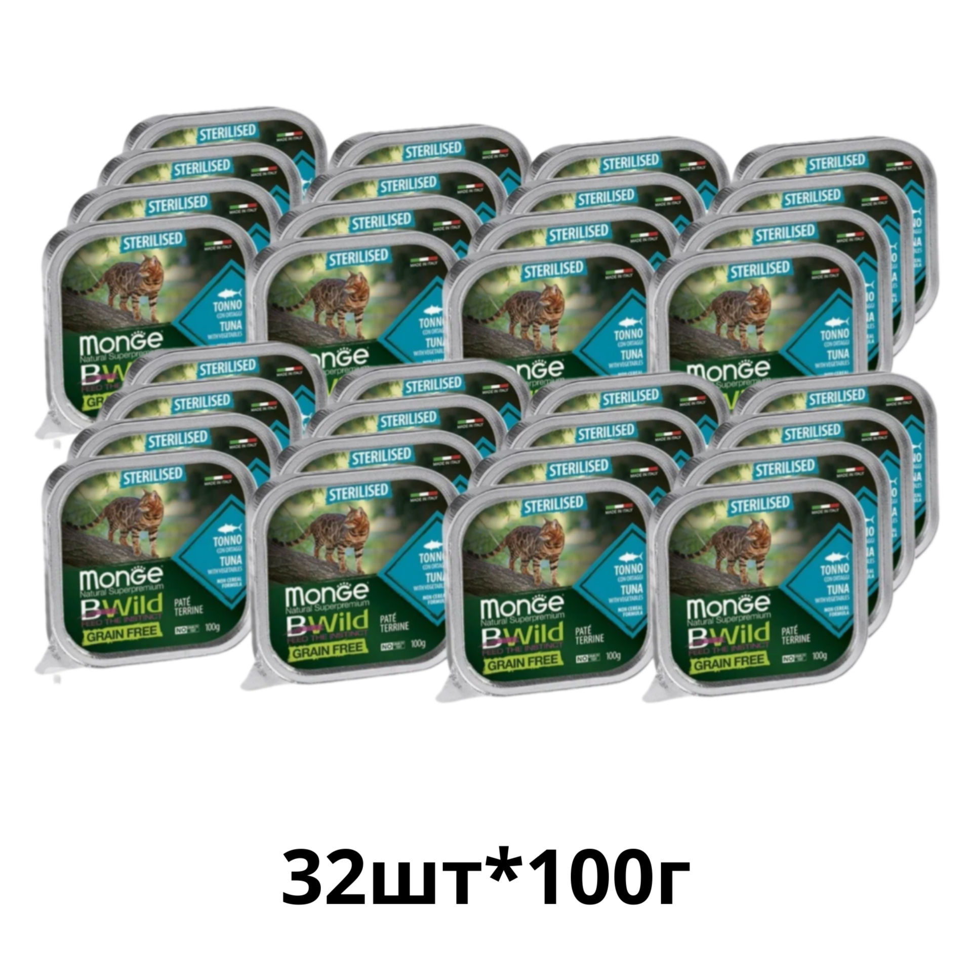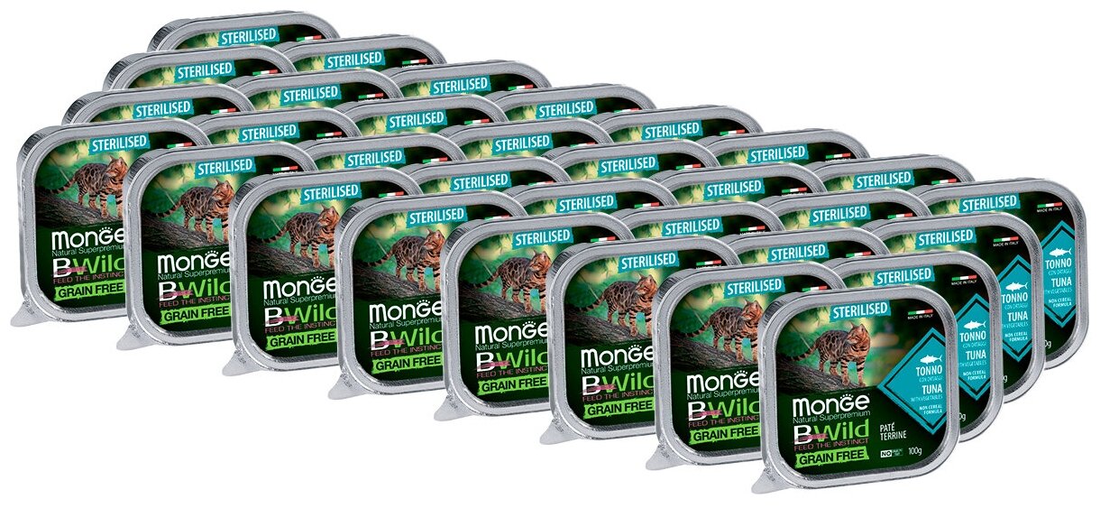 Влажный корм для стерилизованных кошек Monge BWILD Feed the Instinct, беззерновой, с тунцом, с овощами 32 шт. х 100 г (паштет)