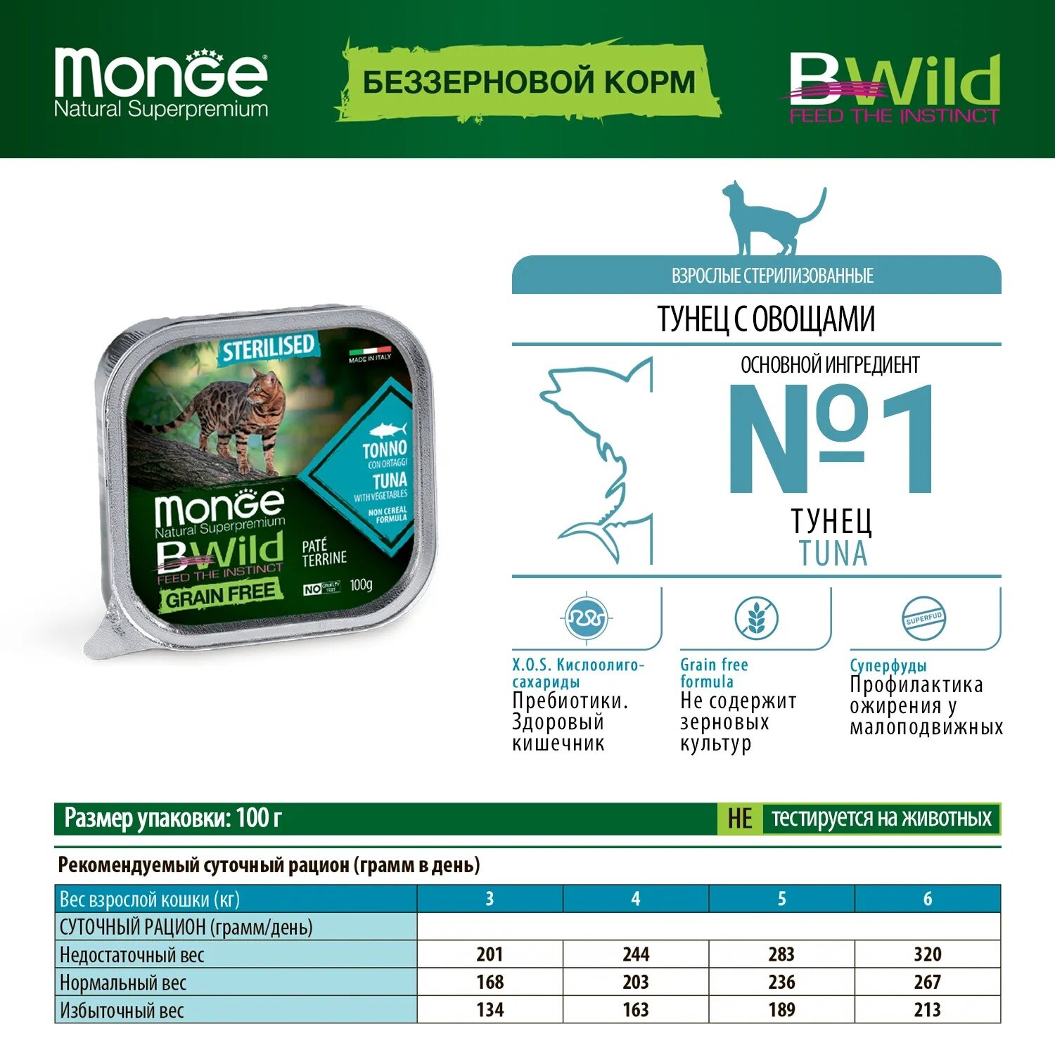 Влажный корм для стерилизованных кошек Monge BWILD Feed the Instinct, беззерновой, с тунцом, с овощами 100 г (паштет)