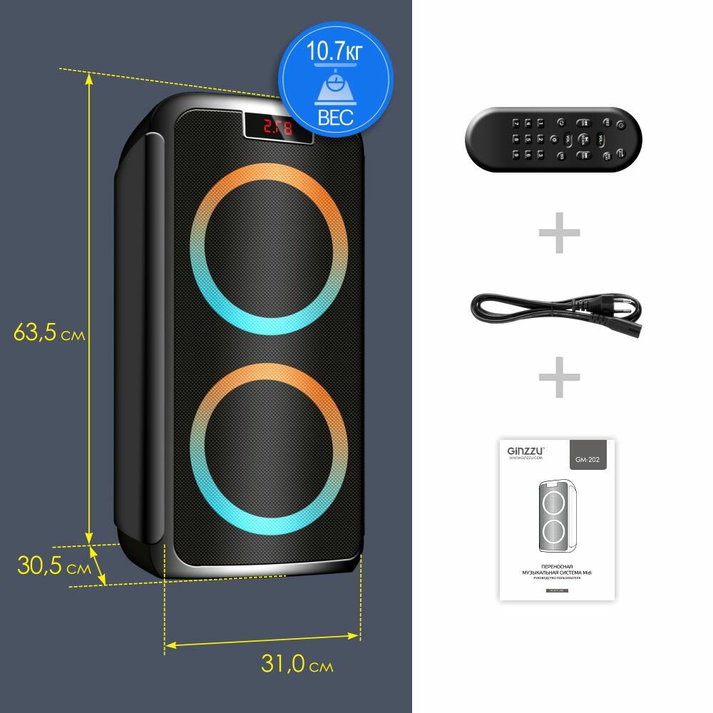 Ginzzu Колонки Ginzzu GM-202, Акустическая система Midi, RGB/BT/USB/SD/FM/ДУ