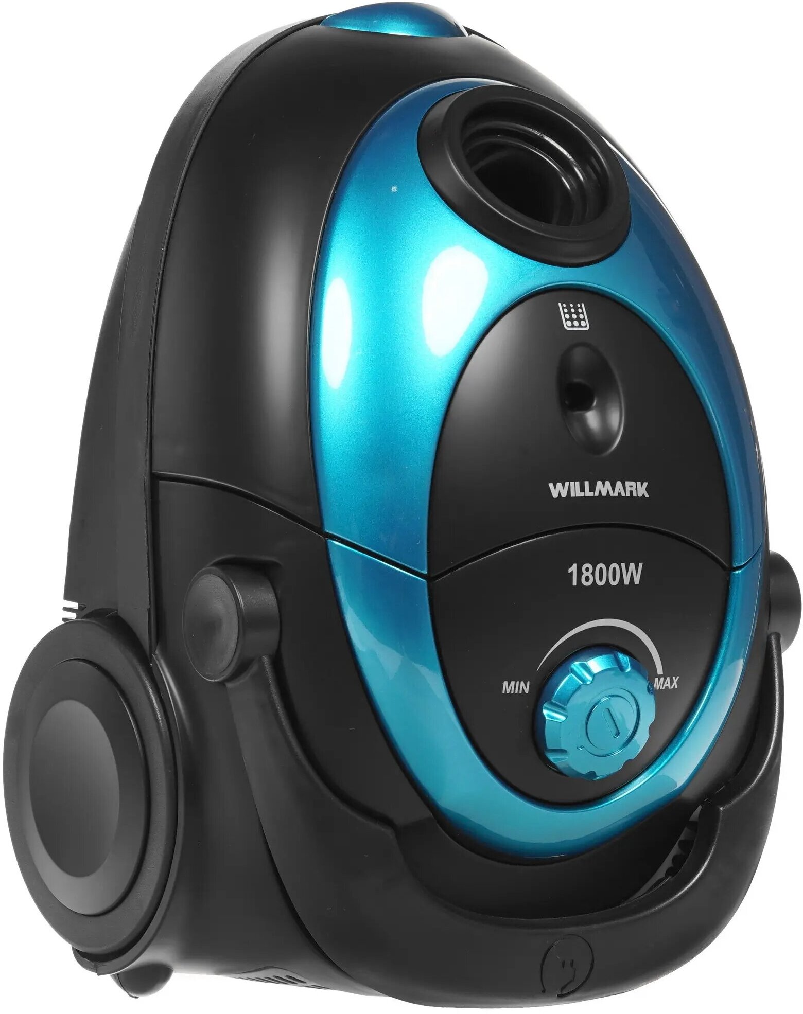 Пылесос для дома Willmark VC-2650DBM, 2000Вт, с фильтром тонкой очистки, мешком 3 л, индикатором заполнения пылесборника, черный/голубой