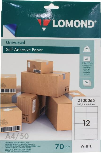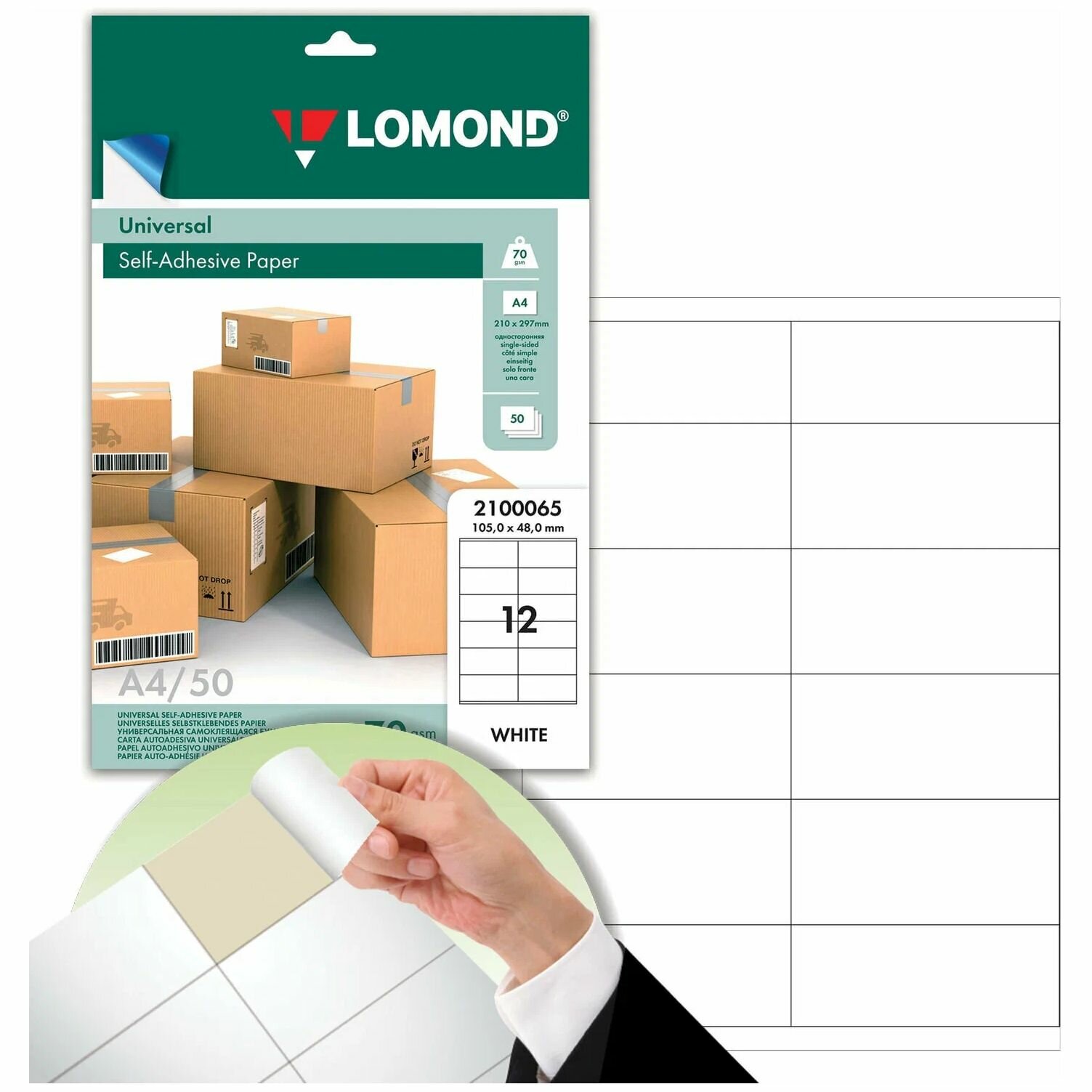 Этикетки самоклеящиеся LOMOND A4 белые, 12 шт на листе (105 x 48 мм), 70 г/м2, 50 листов