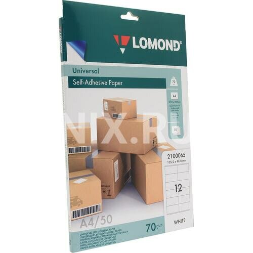 Самоклеящаяся бумага Lomond A4, белая, 12 делений (105 x 48 мм), 70 г/м2, универсальная, для этикеток, 50 листов (2100065)