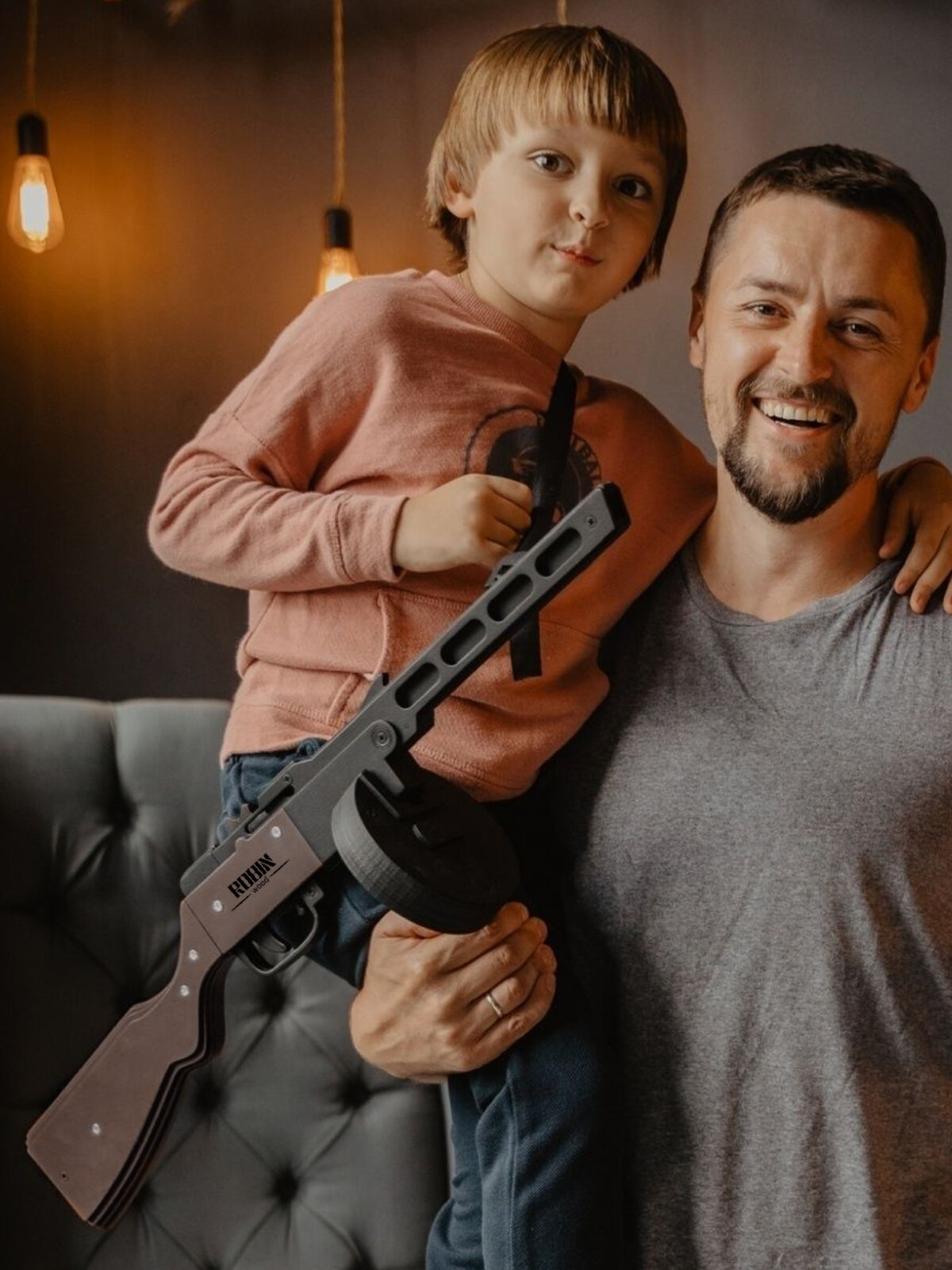 Автомат-резинкострел ППШ со съемным магазином и стрельбой очередями c надписью "с днем Победы" от ARMA. TOYS — деревянный, покрашен под настоящий