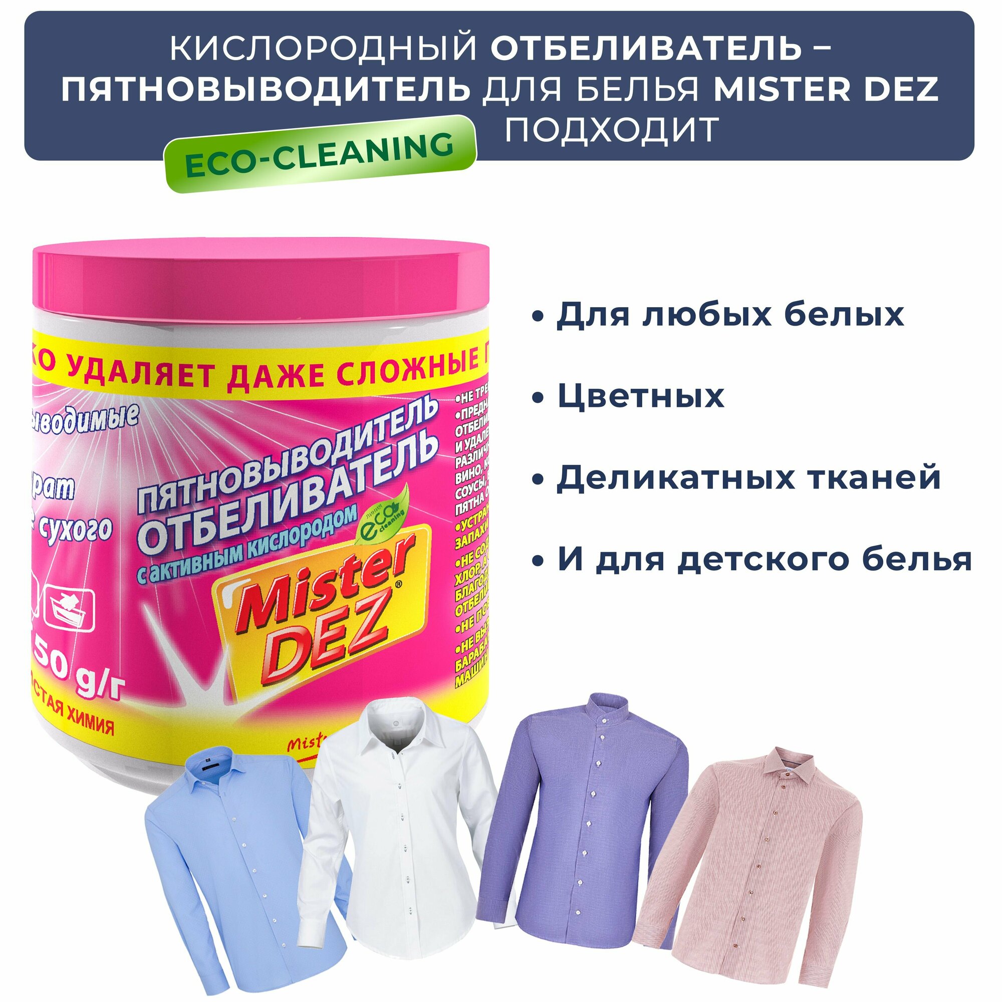 Кислородный отбеливатель-пятновыводитель Mister Dez Eco-Cleaning 1кг, очиститель для белого, цветного белья, детский отбеливатель экологичный, перкарбонат натрия, средство для чистки мебели дома, золота, плиты и кроссовок