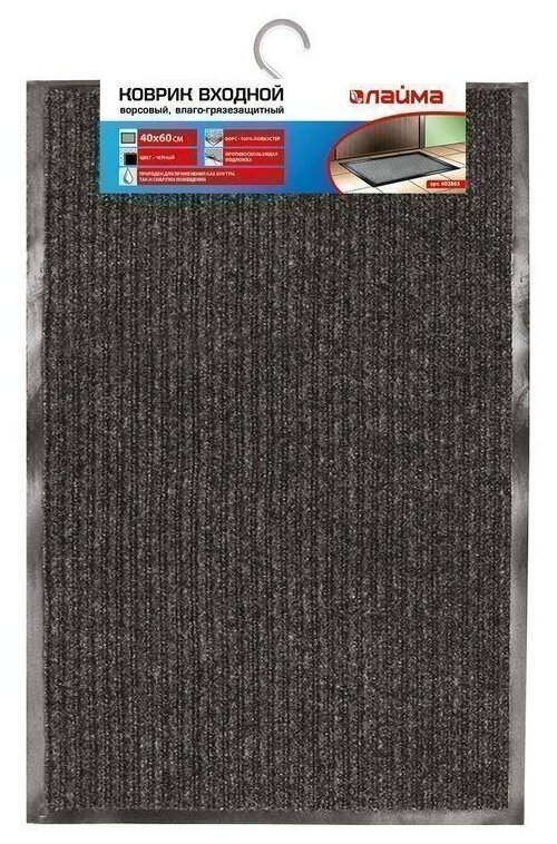 СохранитьКоврик входной ворсовый влаго-грязезащитный LAIMA, 40х60 см, ребристый, толщина 7 мм, черный, 602863 В комплекте: 1шт. интересное: