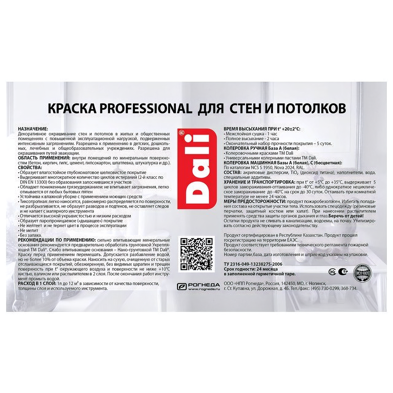 Краска DALI Professional Рогнеда водно-дисперсионные для стен и потолков 0,9л база А моющ. 93219
