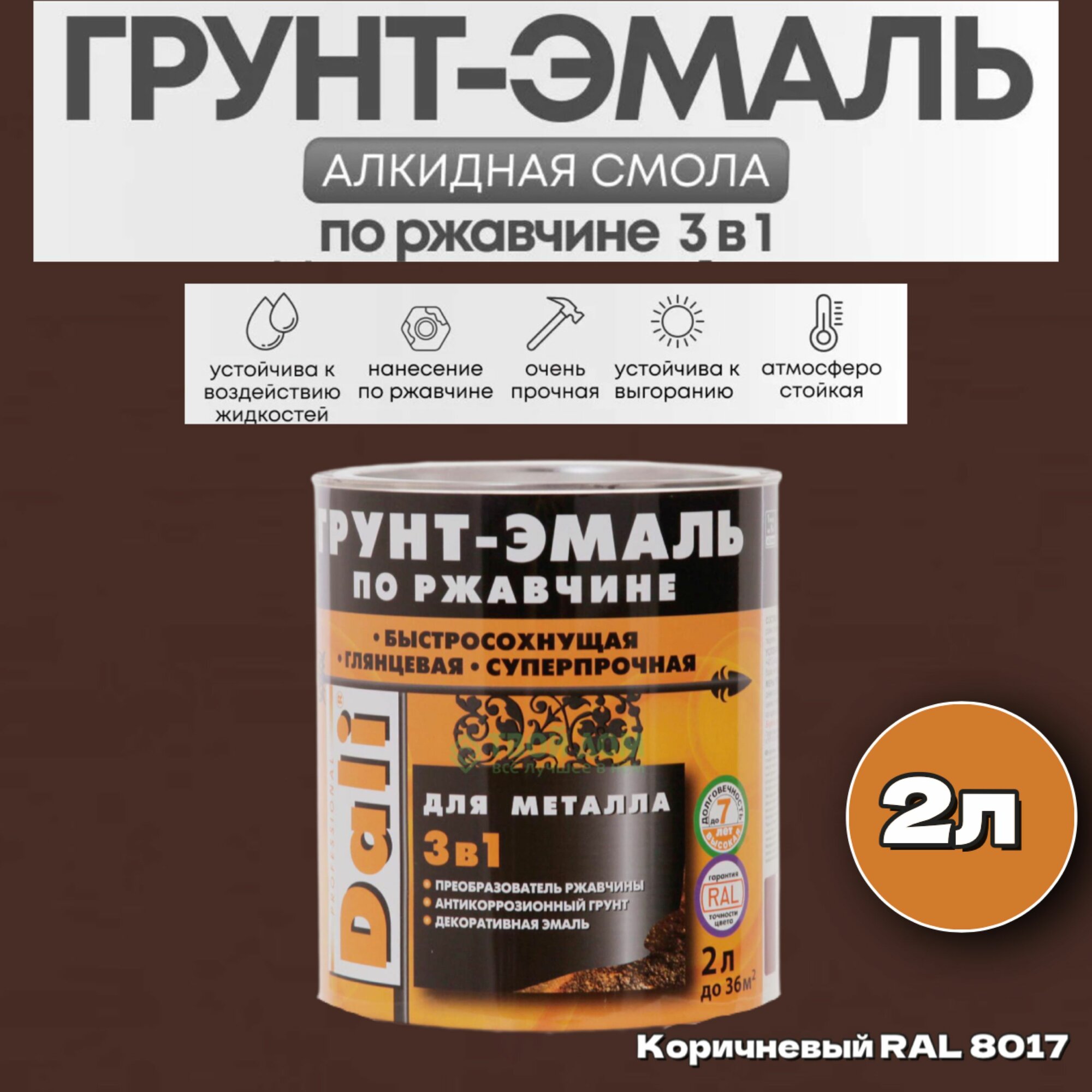 Dali / Дали Грунт-эмаль по ржавчине 3 в 1 гладкая алкидная RAL 8017 коричневый 2л