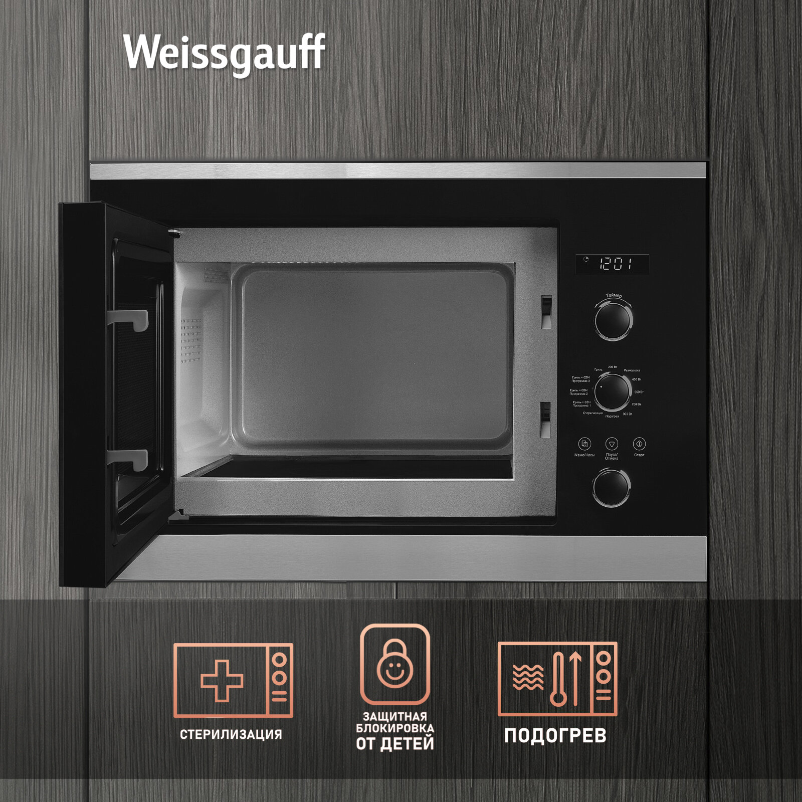 Встраиваемая микроволновая печь без поворотного стола Weissgauff HMT-256 3 года гарантии, Объем 25 литров, Разморозка, Блокировка от детей