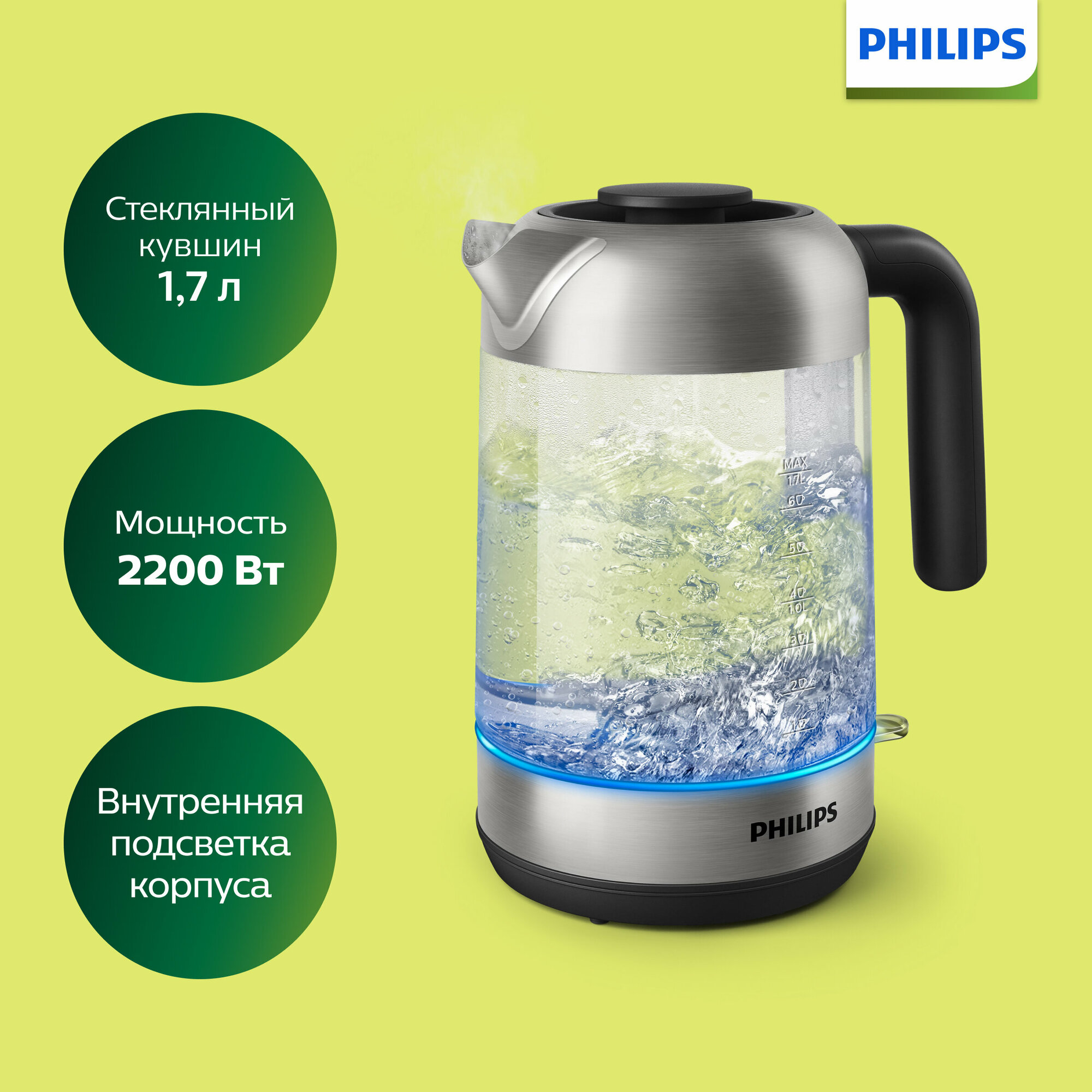 Чайник PHILIPS HD9339/80, 1,7 л, 2200 Вт, закрытый нагревательный элемент, стекло, серебристый, 456948