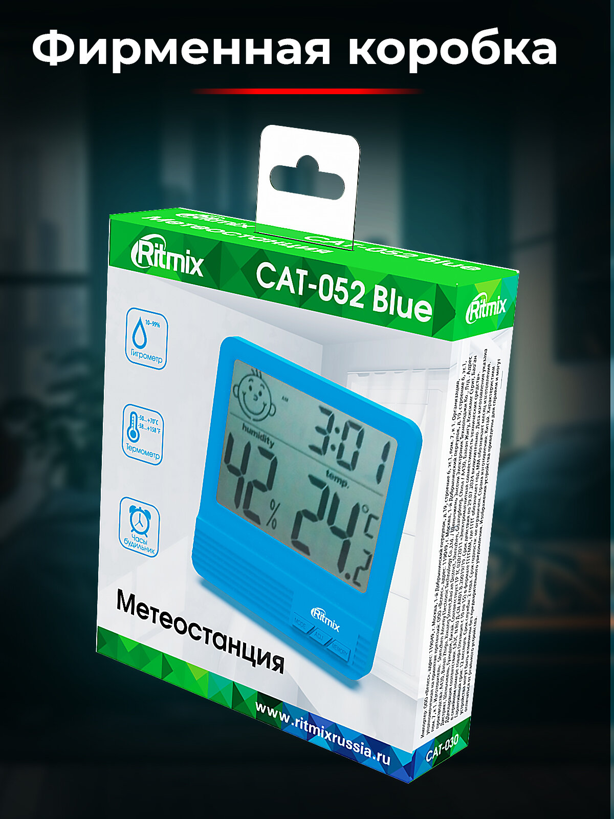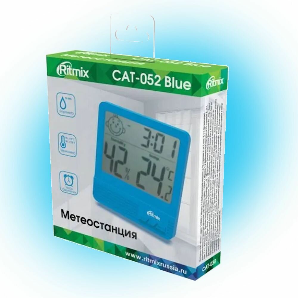 Метеостанция комнатная Ritmix CAT-052 гигрометр, часы-будильник,символ комфорности погоды , синяя