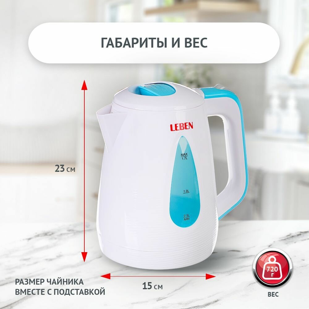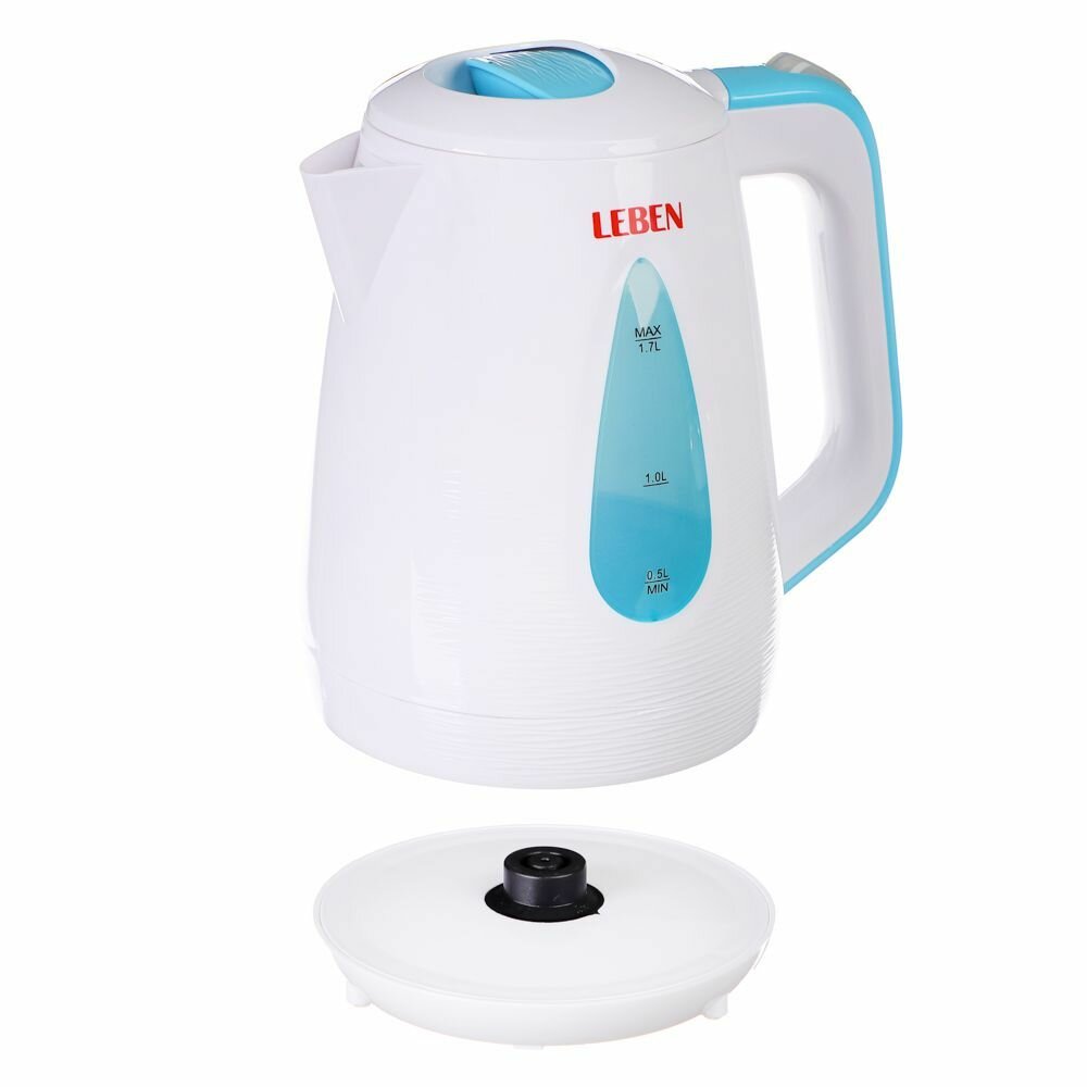 Чайник электрический 1, 7 л LEBEN, 1850 Вт, скрытый нагревательный элемент, пластик, белый/бирюзовый