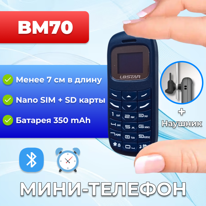 Миниатюрный телефон BM70, батарея 350 мАч, поддержка SIM + SD карт, темно-синий интересное: