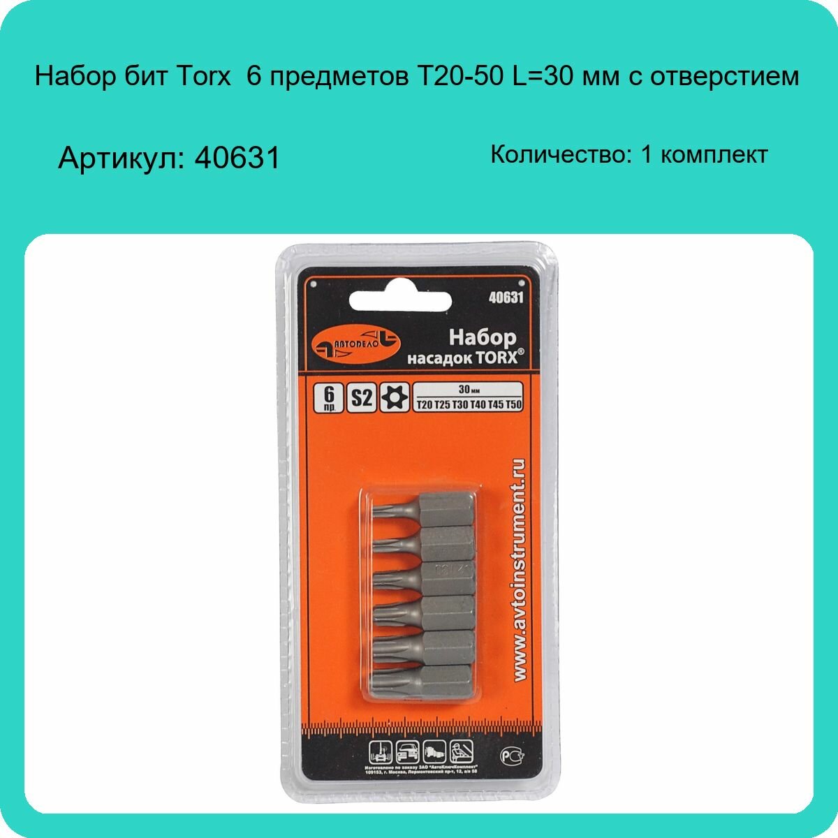 Набор Бит Torx 6 Пр. Т20-50 L=30 Мм С Отверстием Автодело АвтоDело арт. 40631