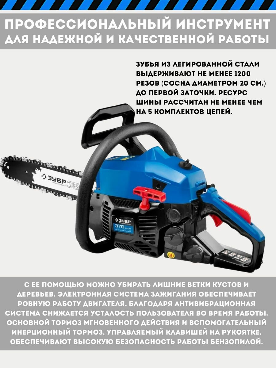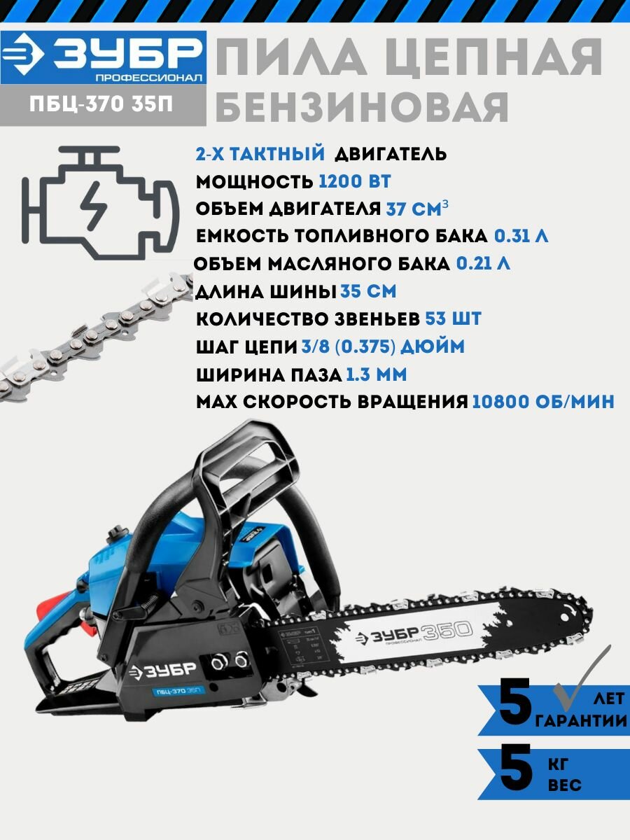 Купить Бензопила "Зубр" 1.2кВт,хромир. цилиндр, праймер, 37 см3 (1,2 кВт), шина 35 см, 10800 об/мин