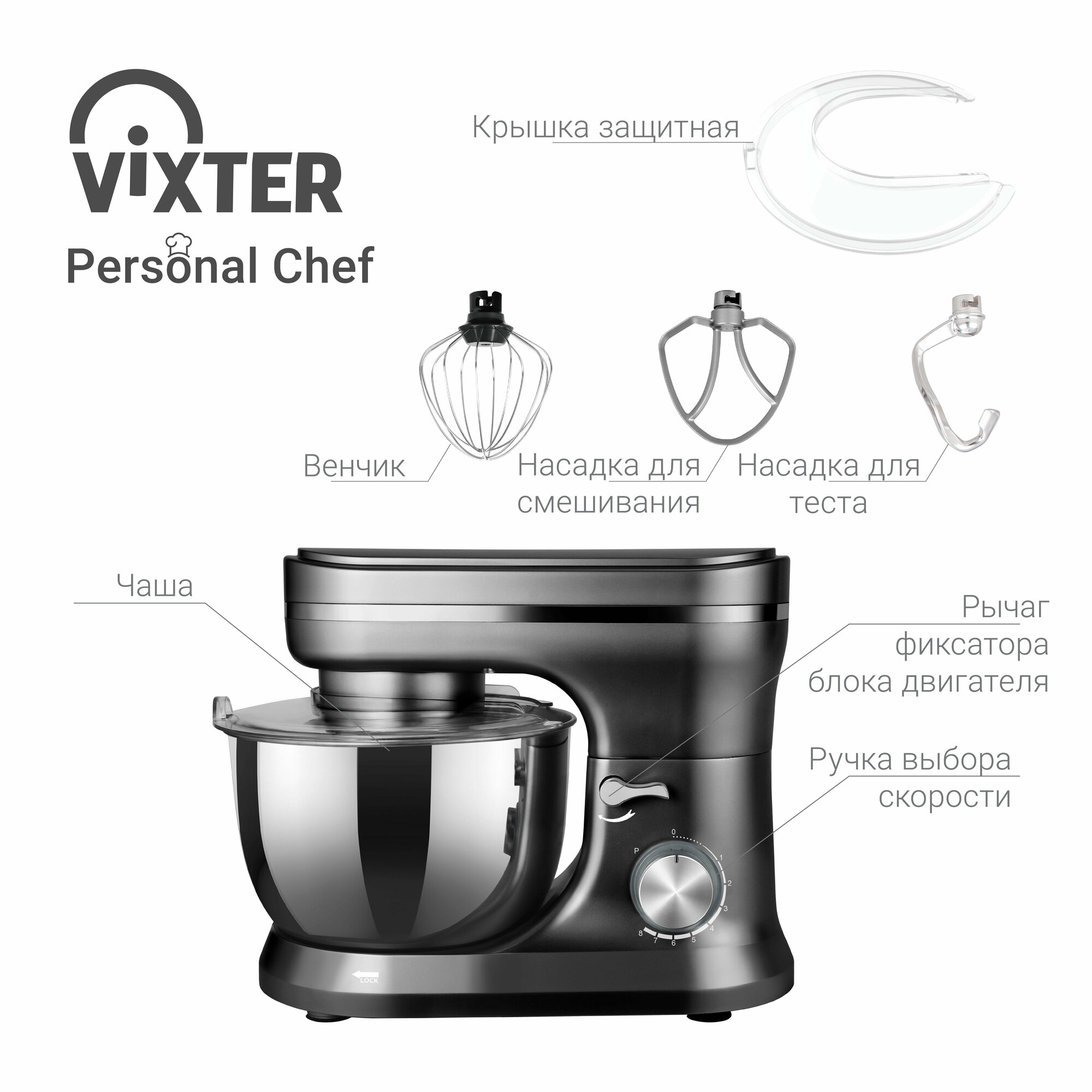 Миксер планетарный Vixter SMP-1345 1000Вт, 8 режимов + импульсный, чаша 4.5л, темный хром