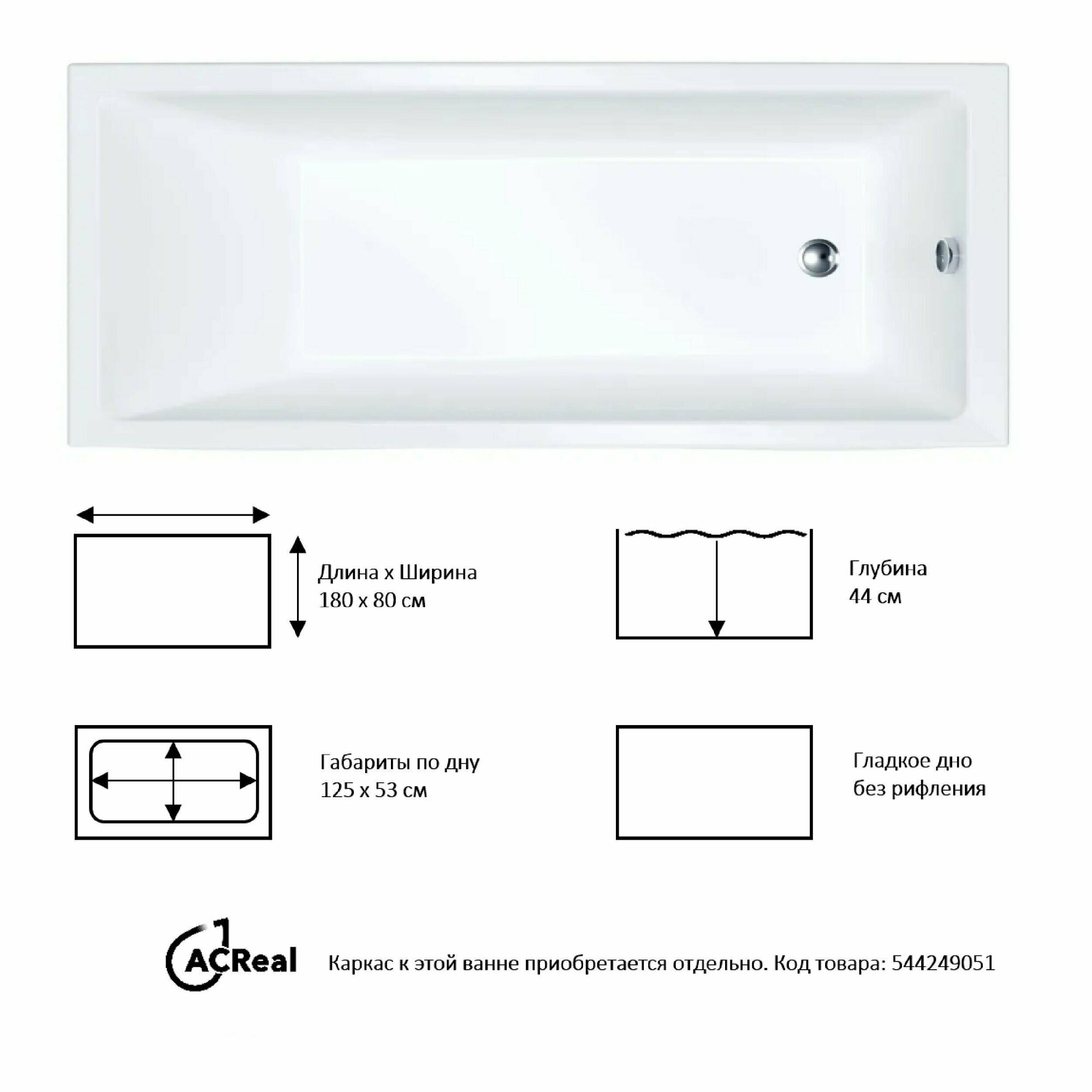 Ванна акриловая 1ACReal Palermo 180х80х44 см без ножек