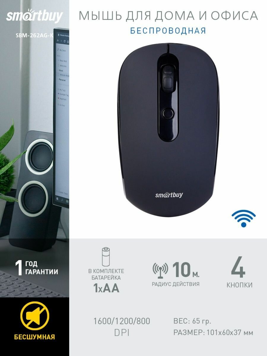 Мышь беспроводная беззвучная Smartbuy ONE 262AG USB/DPI 800-1200-1600/4 кнопки/1AA (SBM-262AG) черн