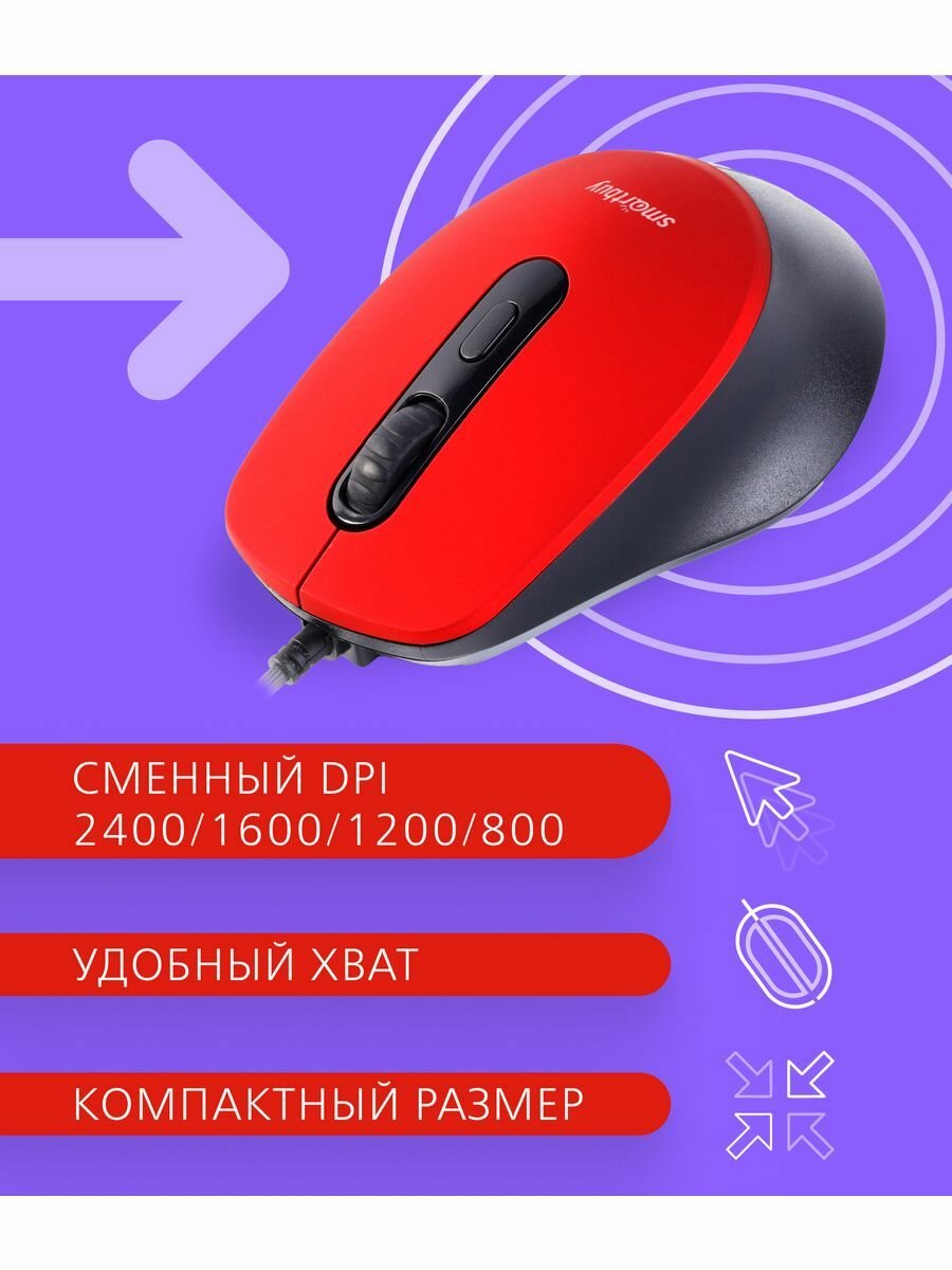Мышь проводная беззвучная Smartbuy ONE 265 USB/DPI 800-1200-1600-2400/4 кнопки/1.5м красная (SBM-265