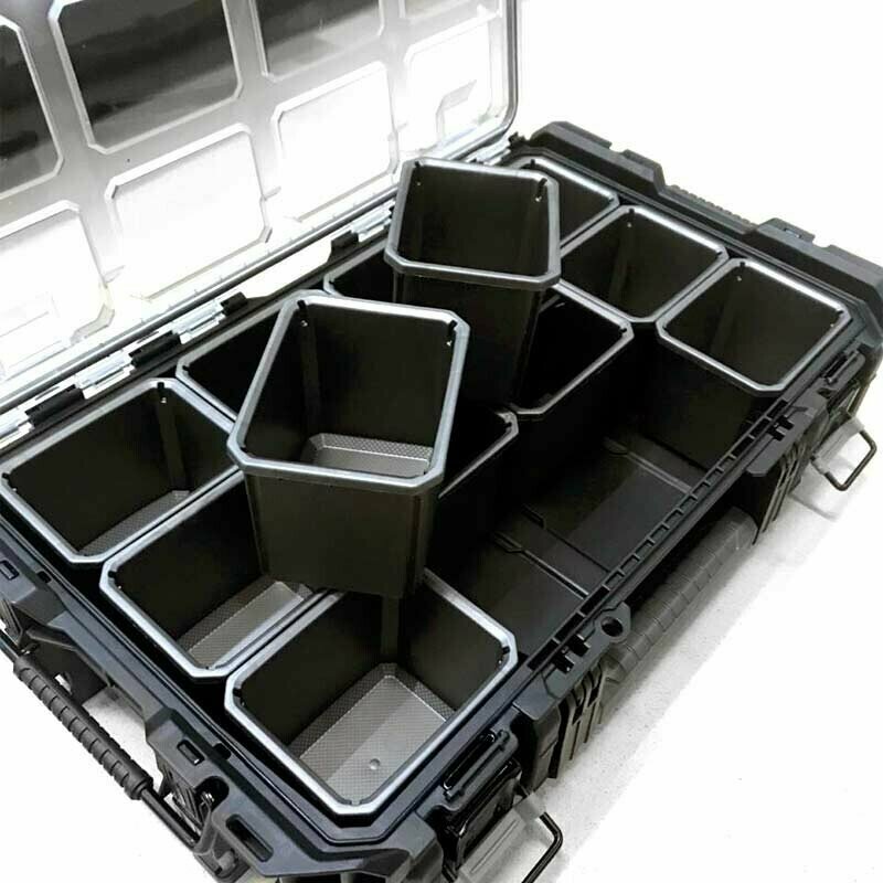| Плюсы: | Вместительный. Прочный. Составляющий системы хранения. Вынимающиеся лотки — можно перемещать между органайзерами для составления нужного набора для конкретной задачи. |