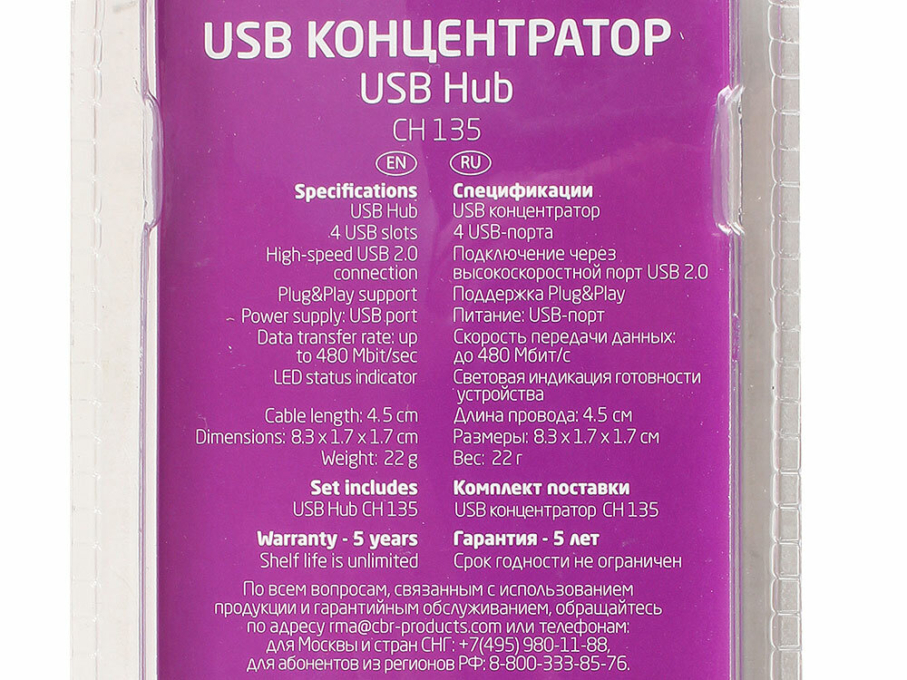 HUB CBR USB-концентратор CH 135, черный, 4 порта, USB 2.0. Поддержка Plug&Play. Длина провода 4,5 см. Скорость передачи данных до 480 Мбит/с. Световая индикация готовности устройства.