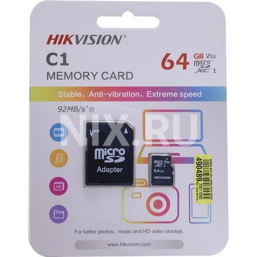 Карта памяти microSDXC 64GB Hikvision C1 Memory Card (HS-TF-C1(STD)/64G/ZAZ01X00/OD) UHS-I U1 Class 10/V30, 92/30 MB/s, 0 C to 70 C, TLC, RTL (012764)