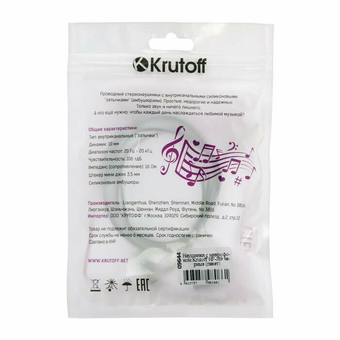 Купить Krutoff Наушники Krutoff HF-J69, вакуумные, микрофон, 106 дБ, 16 Ом, 3.5 мм, 1 м, черные