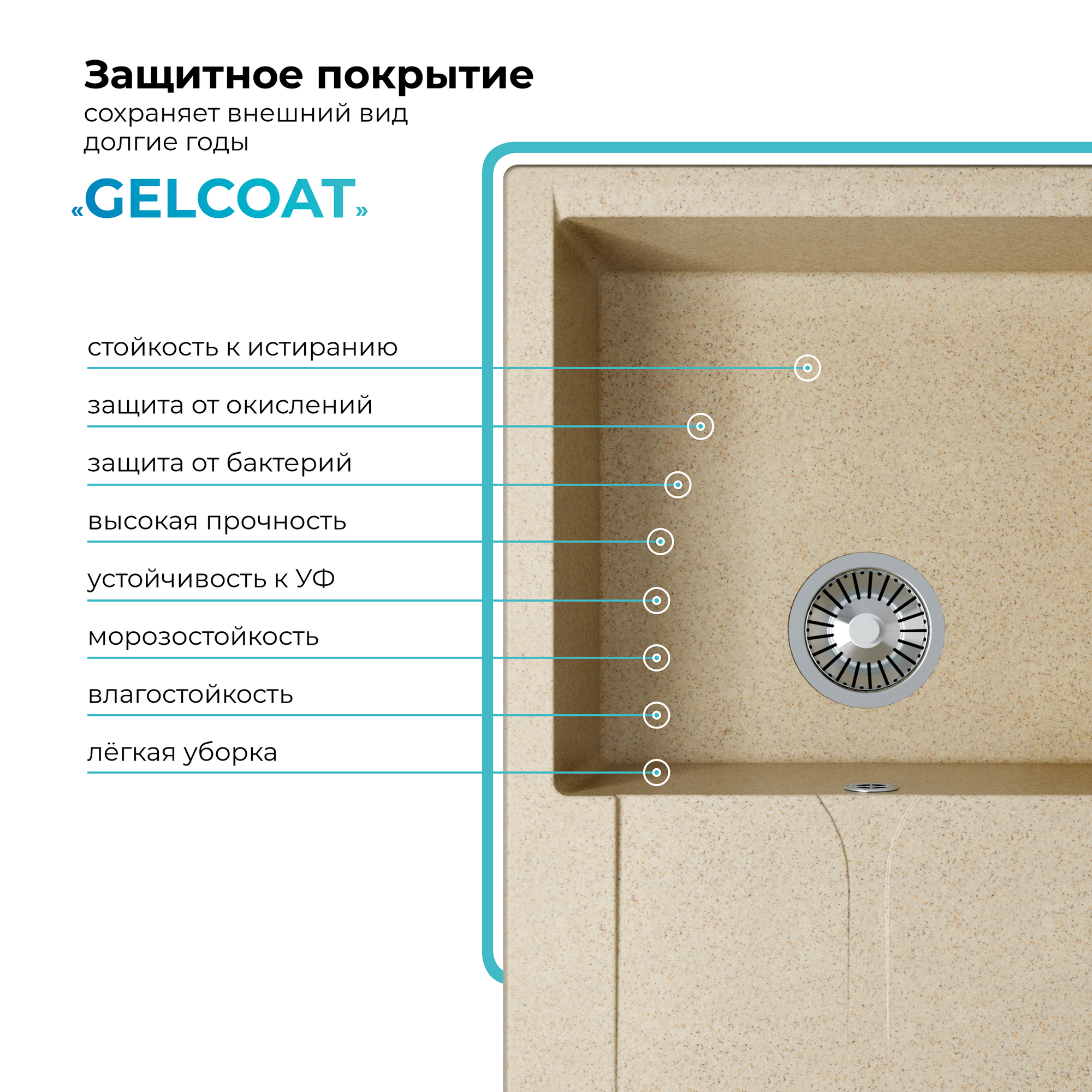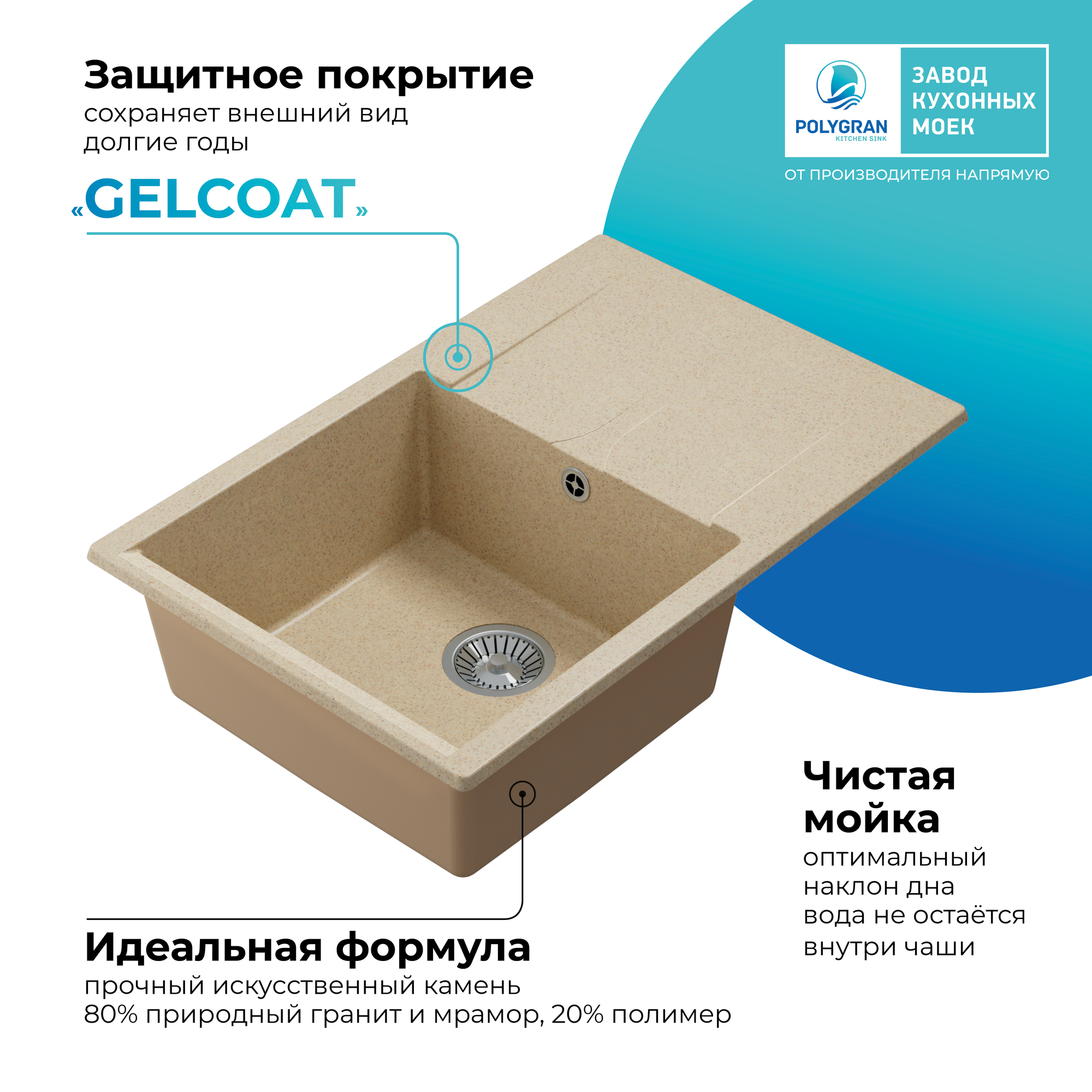 СохранитьМойка для кухни POLYGRAN Gals-760 каменная, врезная, раковина кухонная с крылом (№328 Опал) интересное: