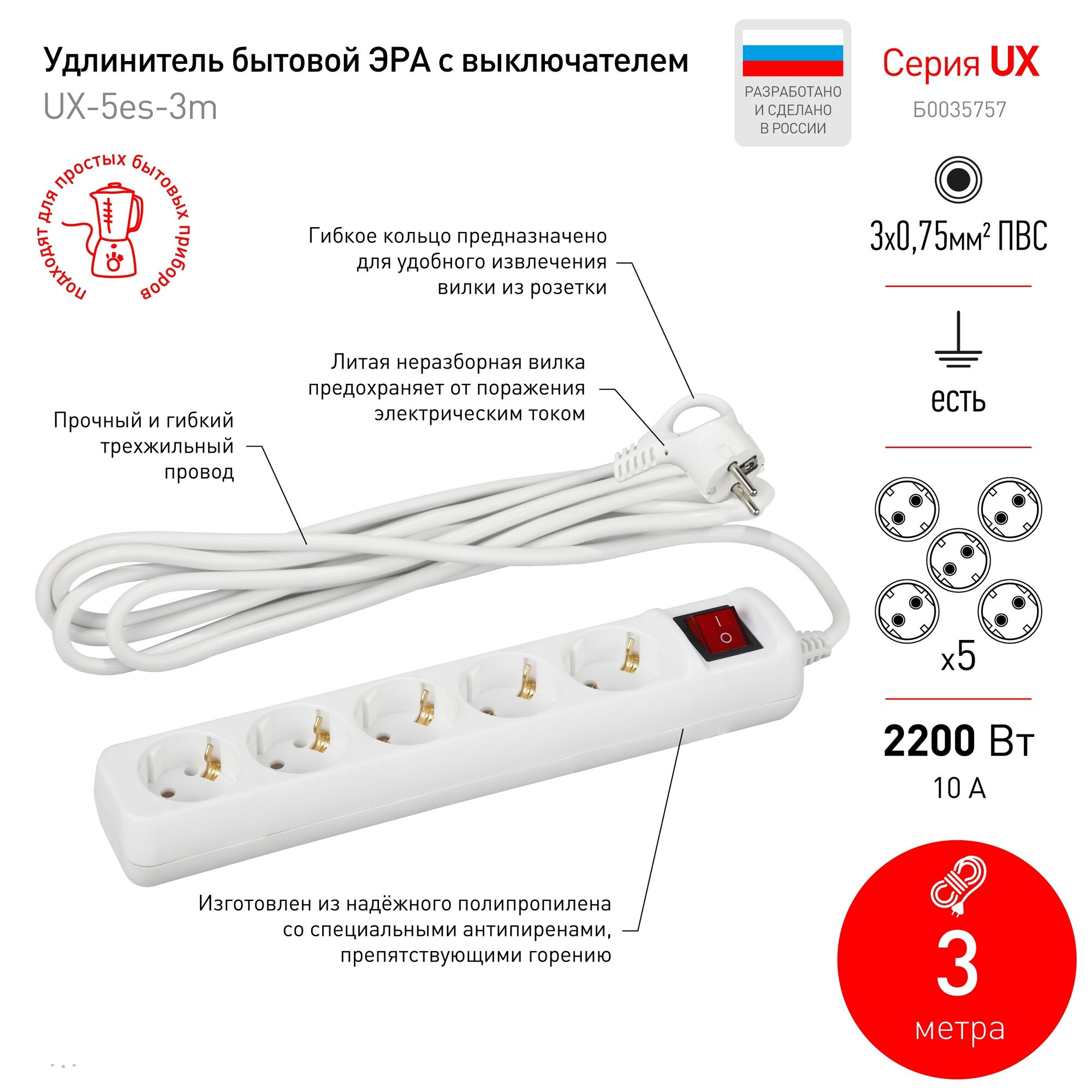 ЭРА Б0035757 Удлинитель UX-5es-3m c заземлением, 3x0,75мм2, c выкл. 5гн, 3м