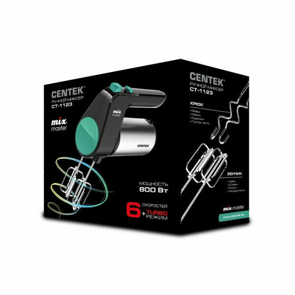 Миксер CENTEK CT-1123 черный/сталь (800Вт, 6 скоростей+турбо, взбивание/замешивание) интересное: