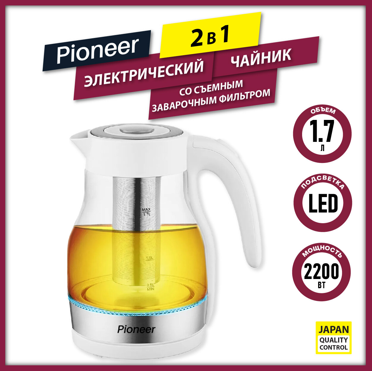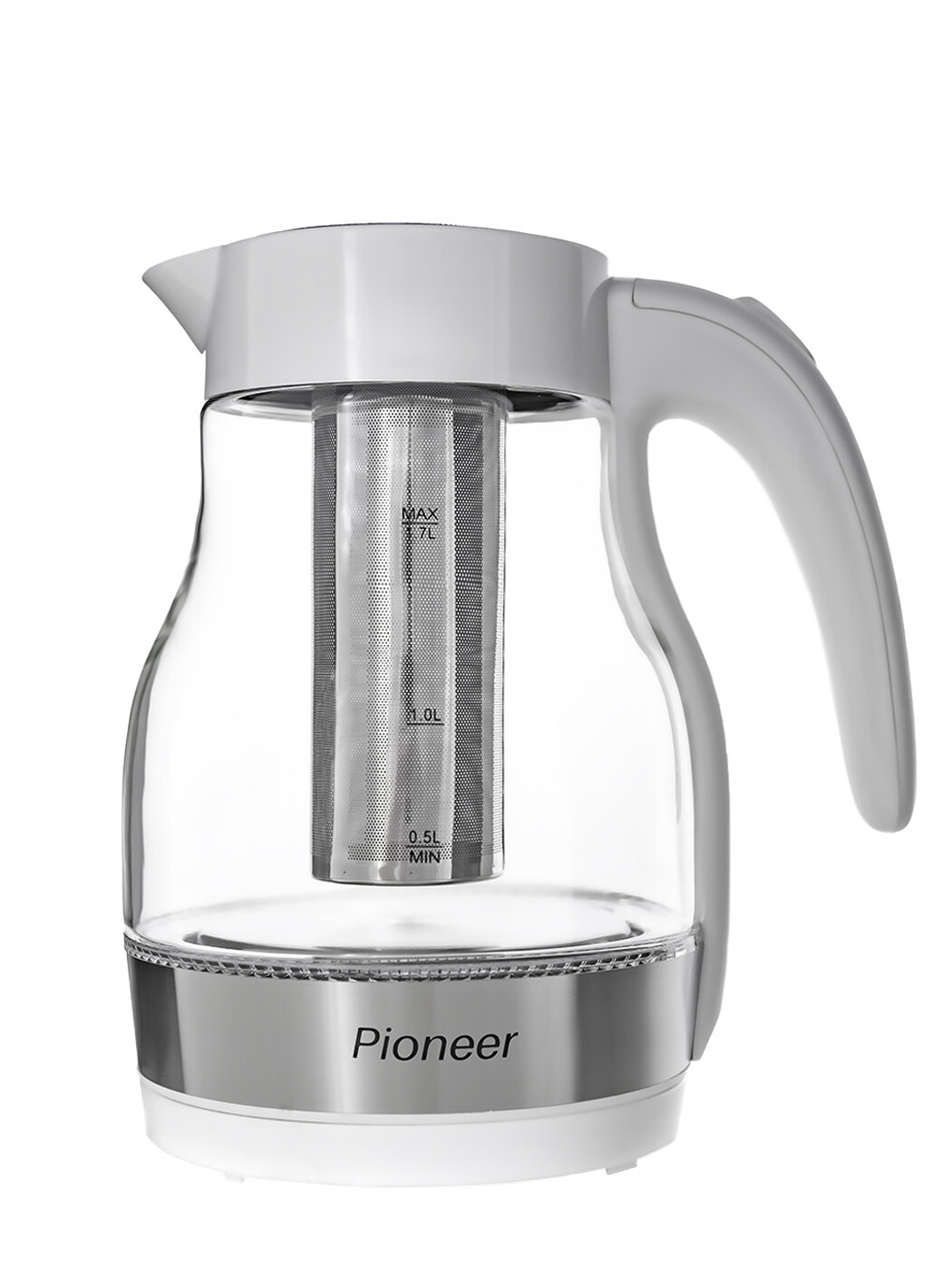 Электрический чайник Pioneer KE802G white, 2 в 1 из боросиликатного стекла со съемным заварочным фильтром, LED подсветка, съемная крышка, 1,7 л, 2200 Вт