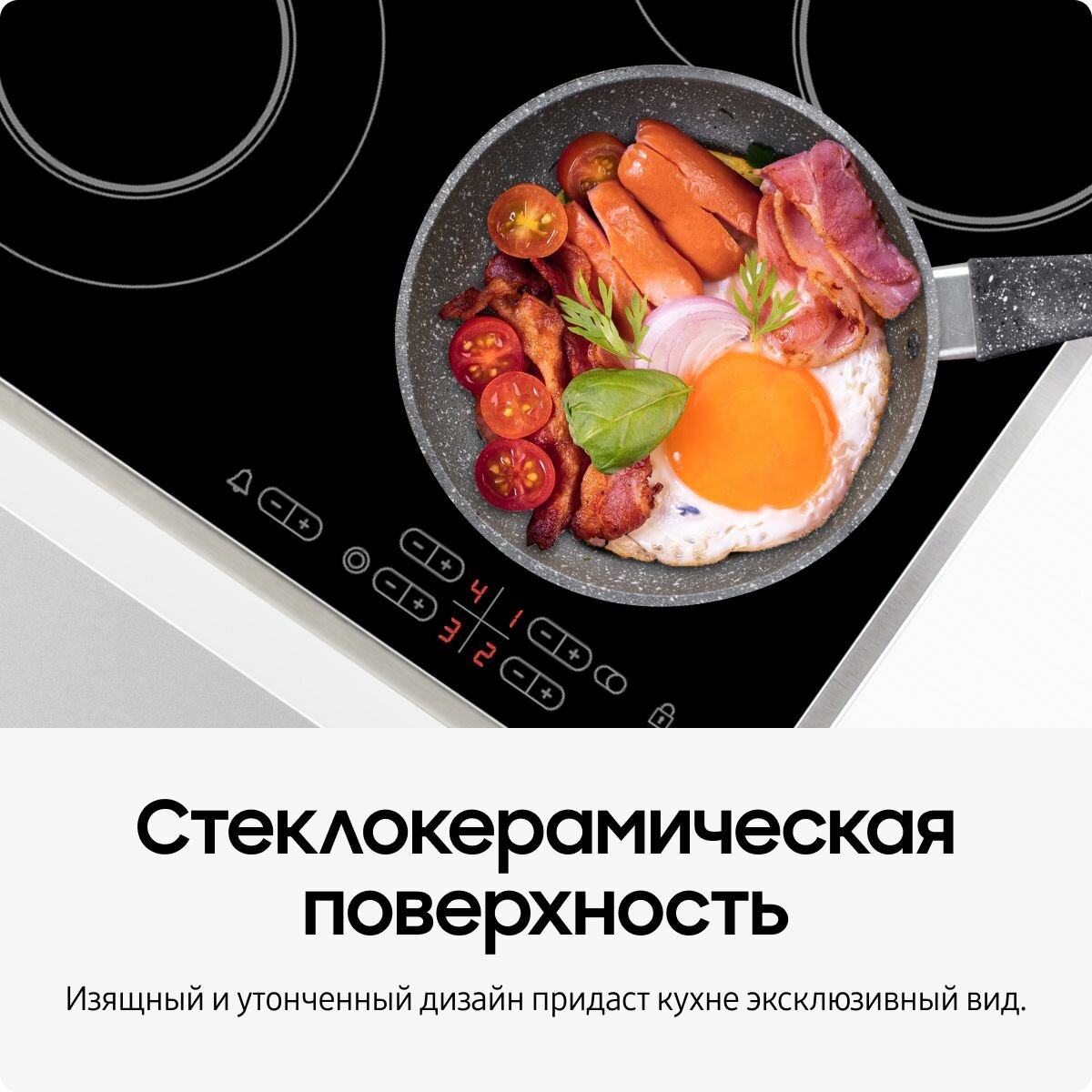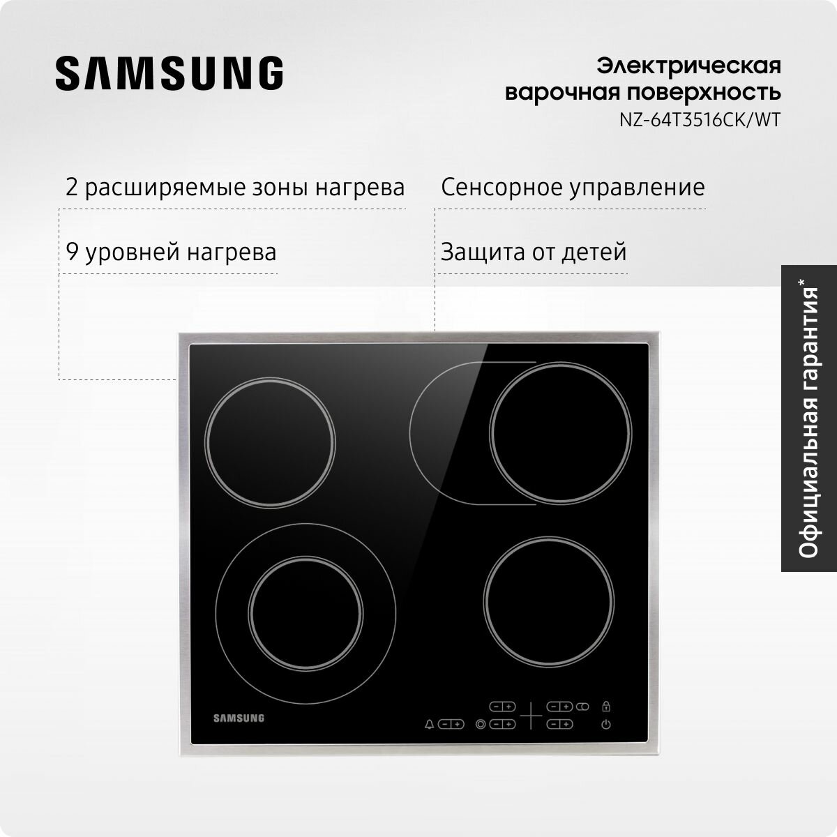 Стеклокерамическая варочная поверхность Samsung NZ-64T3516CK/WT, 2 расширяемые зоны нагрева, с сенсорным управлением, 9 уровнями нагрева, черная