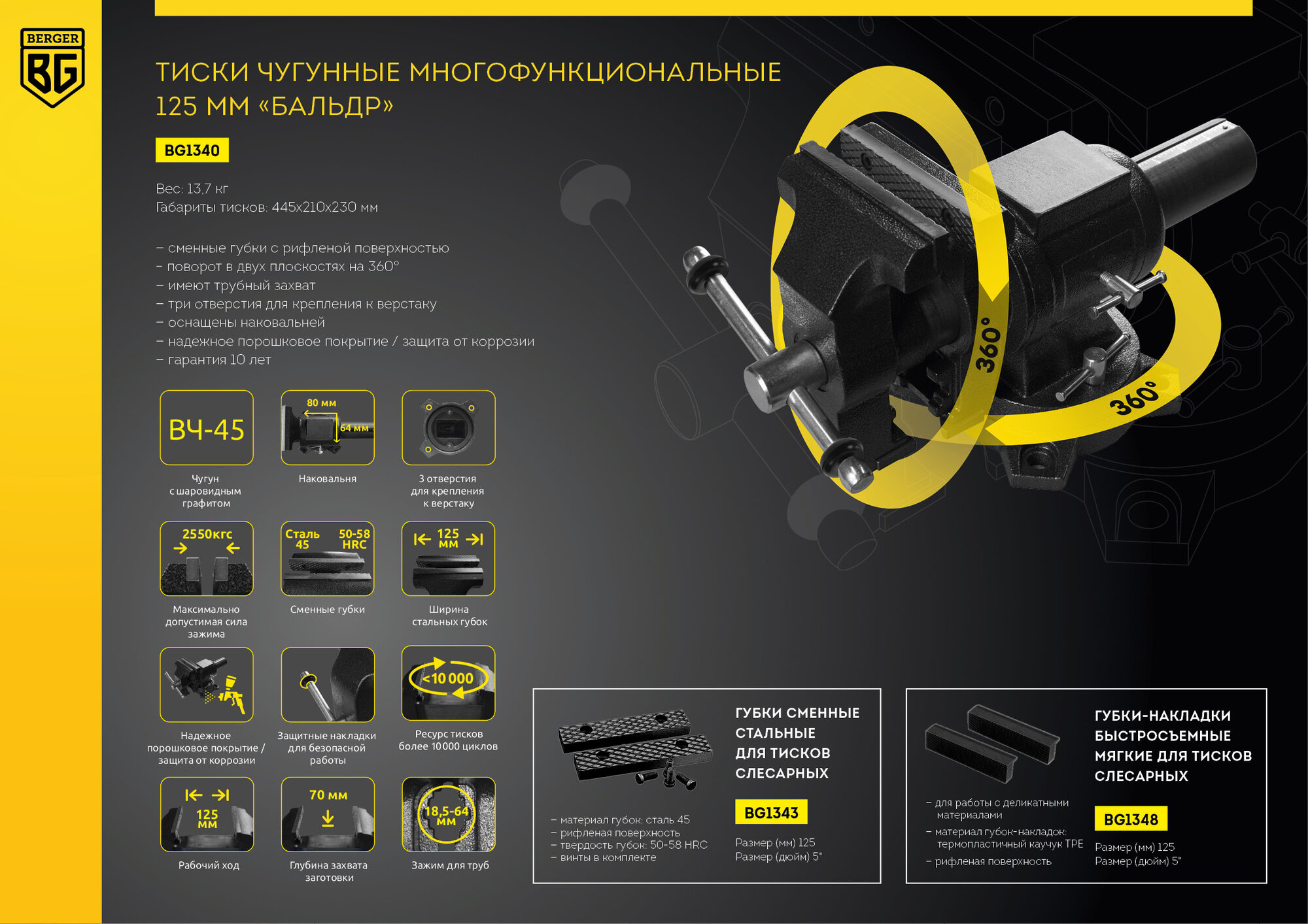 BG1340 Berger BG Тиски чугунные поворотные в 2-х плоскостях с трубным зажимом и наковальней Бальдр B .