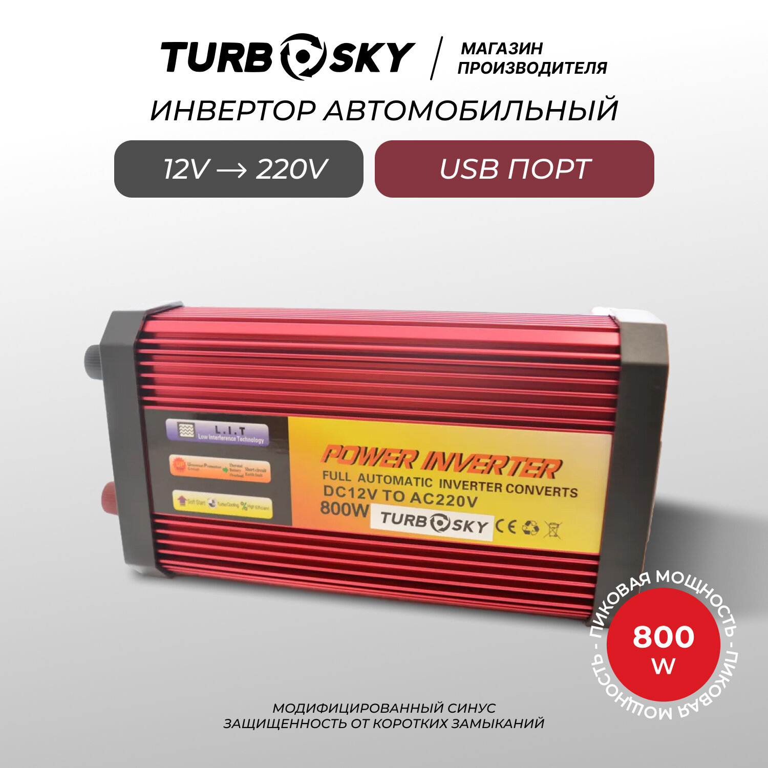 Инвертор Turbosky PI-800, Инвертор автомобильный 12 220 IN-800W, сеть 220В - там, где нужно / Преобразователь напряжения 12 в 220 Turbosky PI-800 с защитой от перегрузки и перегрева / Инвертор напряжения автомобильный 800Вт с Евророзеткой и USB, модифицир