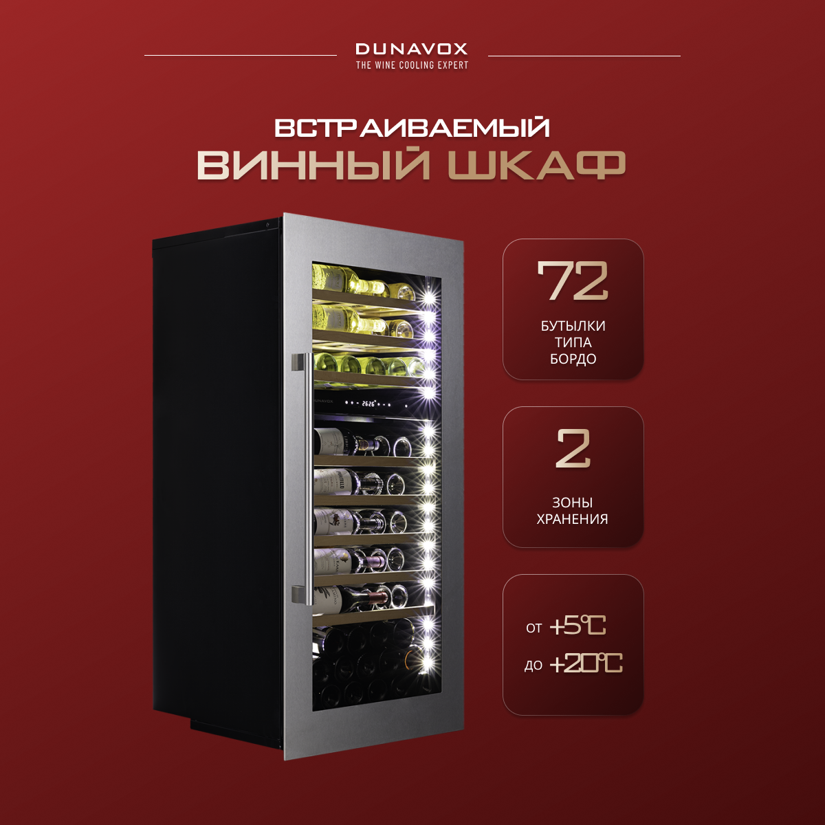 Винный холодильный шкаф Dunavox DAVS-72.185DSS компрессорный (встраиваемый / отдельностоящий холодильник для вина на 72 бутылки) интересное: