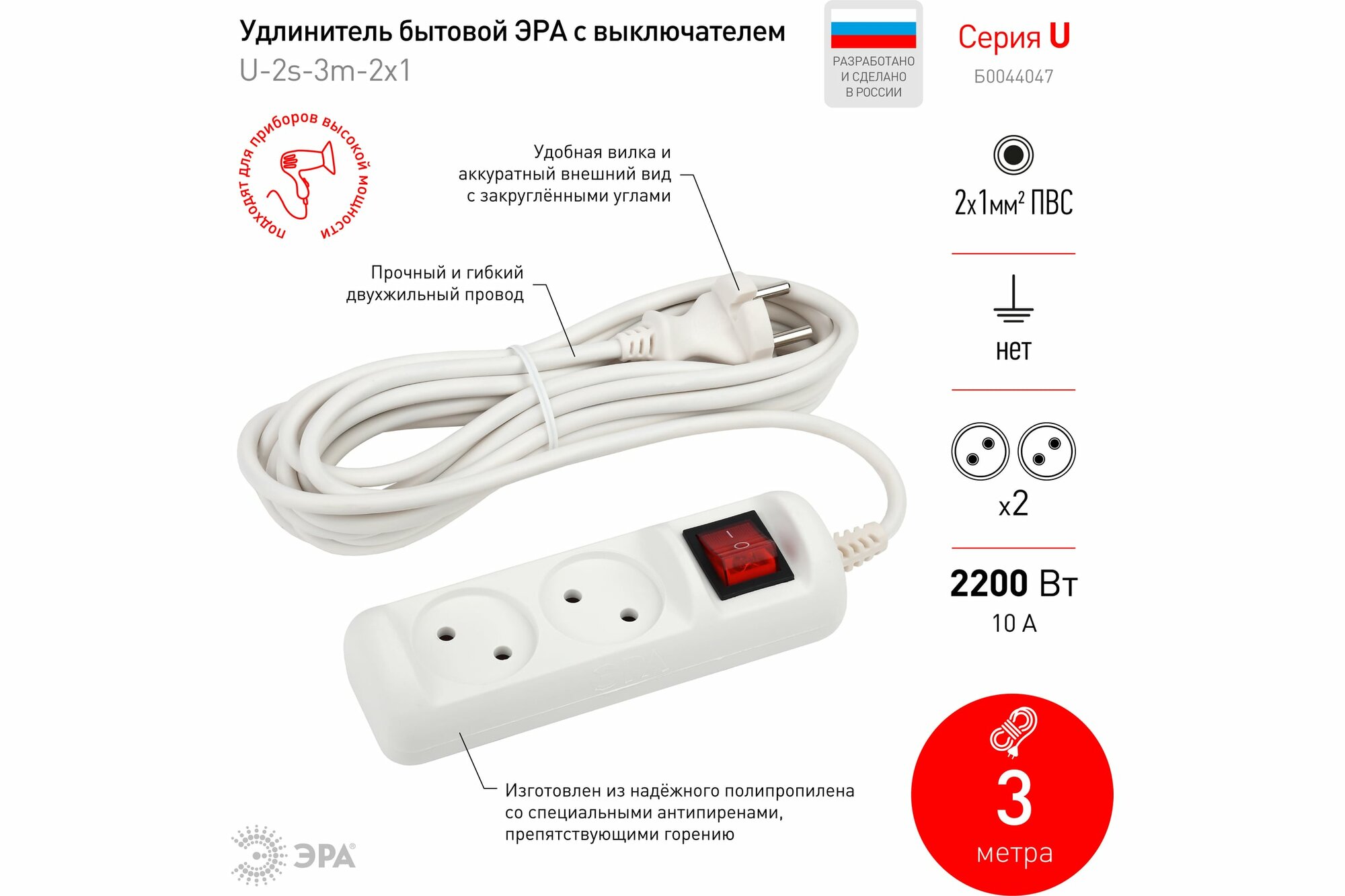 Удлинитель электрический ЭРА U-2s-3m-2x1 без заземления c выключателем 2 розетки 3м ПВС 2x1мм² 10А арт. Б0044047 (1 шт.)