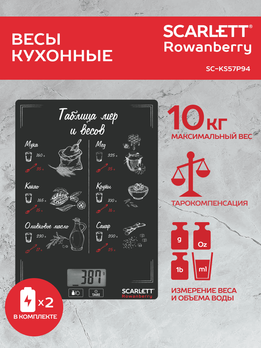 Весы кухонные SCARLETT SC-KS57P64, электронный дисплей, max вес 10 кг, тарокомпенсация, стекло интересное: