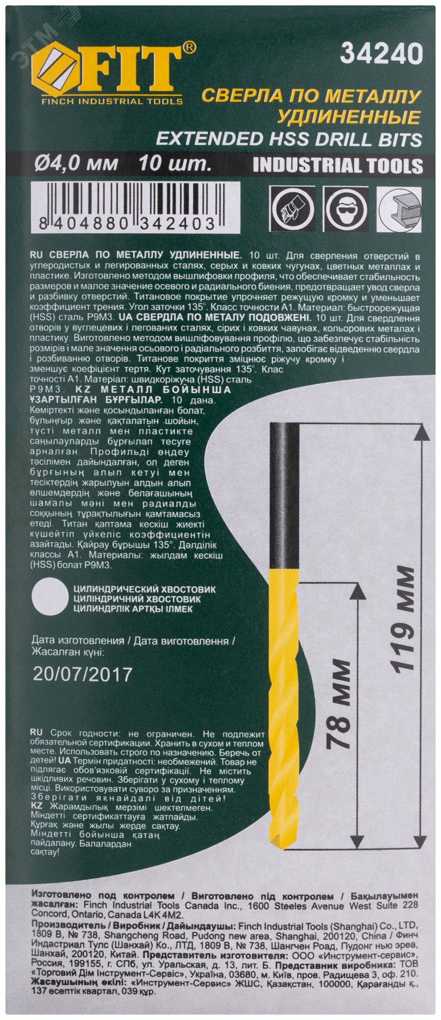 Сверла HSS по металлу, удлиненные, титановое покрытие 4,0х119 мм (10 шт.), FIT 34240 (1 шт.)