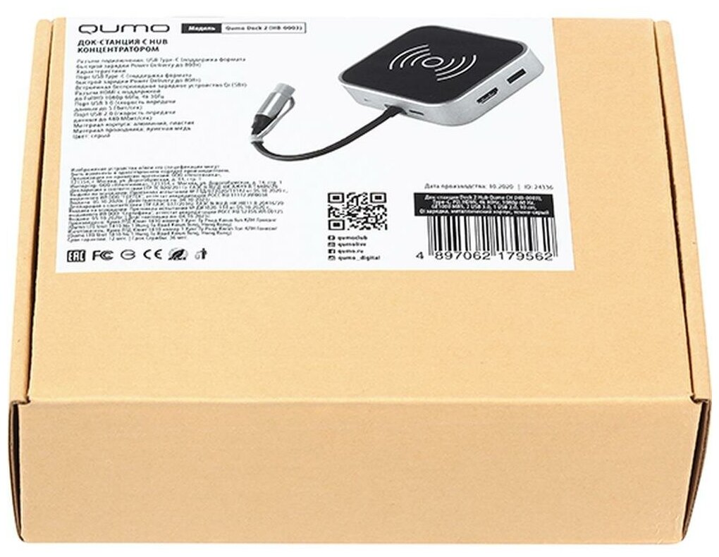 Мультифункциональная док-станция Qumo Dock 2 Hub CH (HB-0003), Type-C, PD, HDMI, 4k 30Hz, 1080p 60 Hz, GE1000 MBS, 2 USB 3.0, 1 USB 2.0, 10 cm, Qi зарядка, металлический корпус, темно-серый