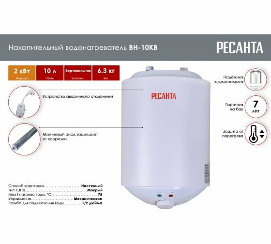 Водонагреватель накопительный ВН-10КВ Ресанта 74/5/9
