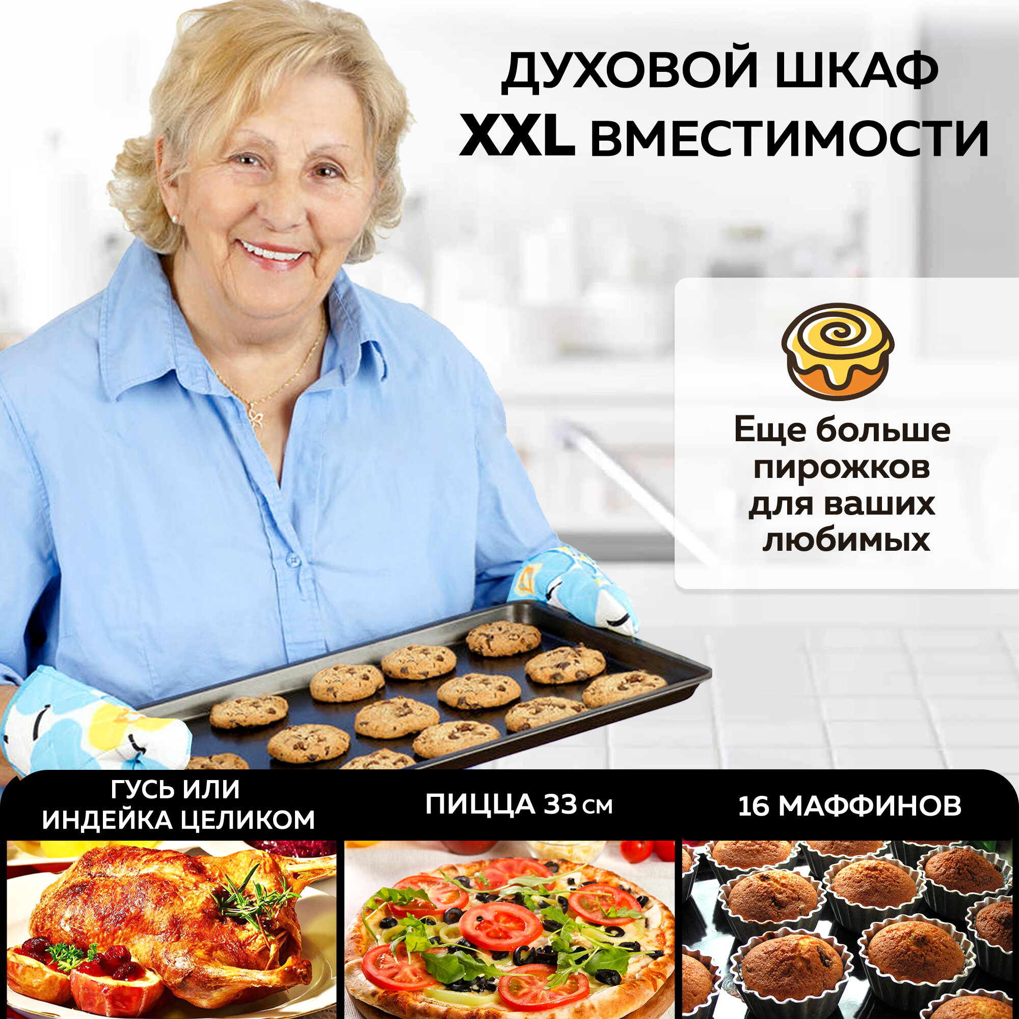 | Минусы: | По ощущениям температура не дотягивает до написанной, например если в рецепте написано запекать при 180, то в этой печи нужно поднять хотя бы до 200 или больше. Но это не вызывает негатива, просто нужно помнить. Вилка с проводом реально короткие, скорее всего без удлинителя не обойтись. |
