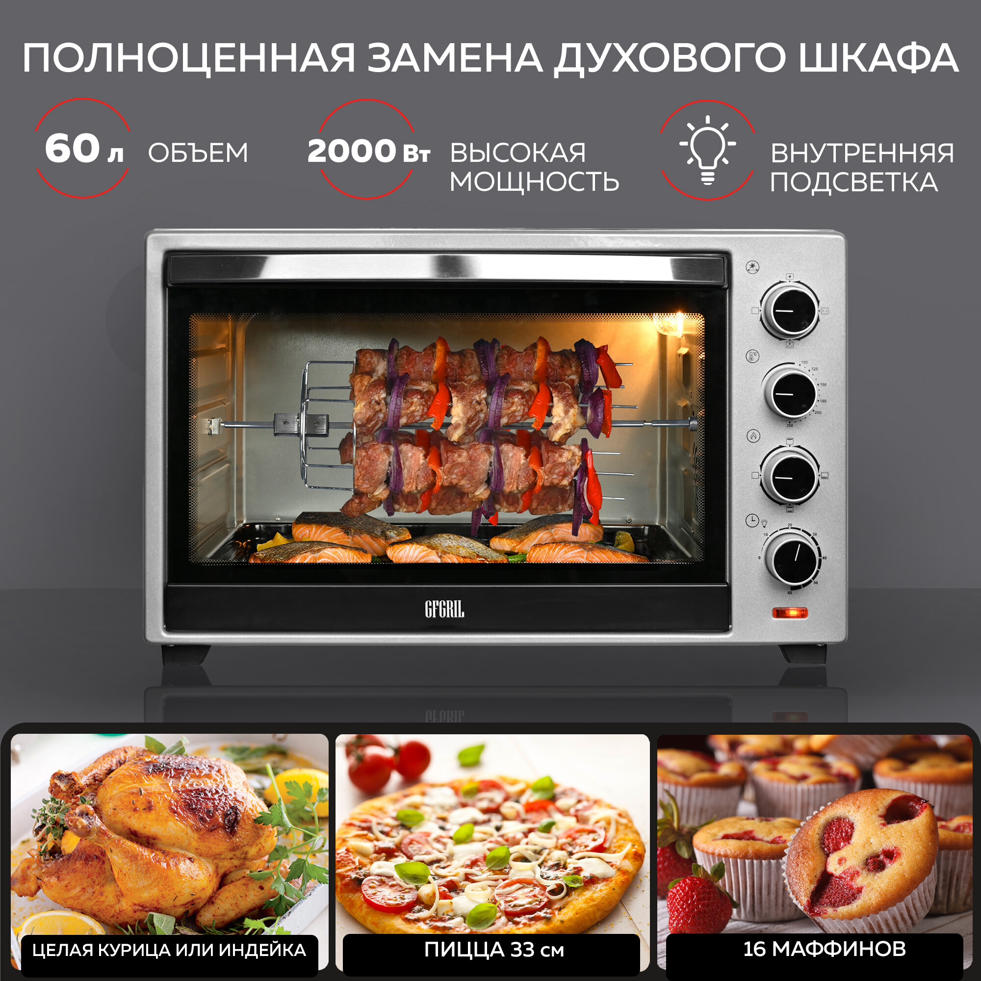 GFGRIL Многофункциональная мини-печь GFO-62, духовой шкаф 2 200 Вт, конвекция, вертел, шашлычница, нержав.сталь; мини печь