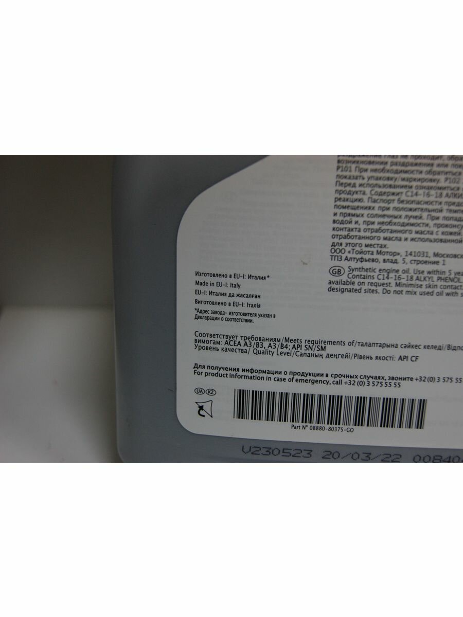 Toyota motor oil 5w40 sn/sm acea a3/b3, a3/b4 (европа) / моторное масло синтетическое 1 л 08880-80376