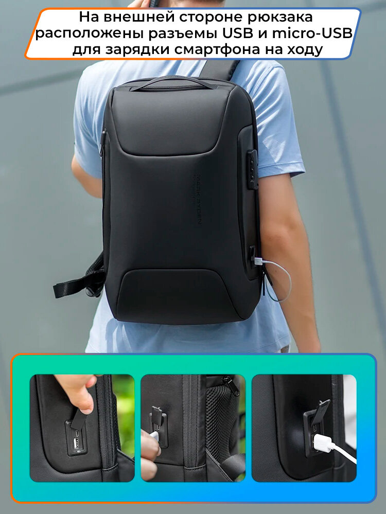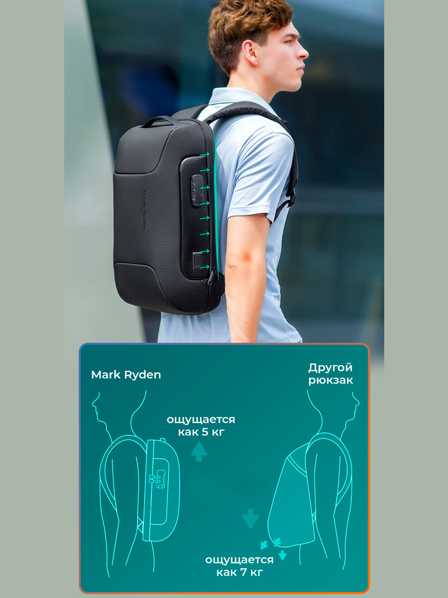 Рюкзак-антивор мужской городской дорожный Mark Ryden вместительный 21л, для ноутбука 15.6", водонепроницаемый, с USB зарядкой и кодовым замком, черный