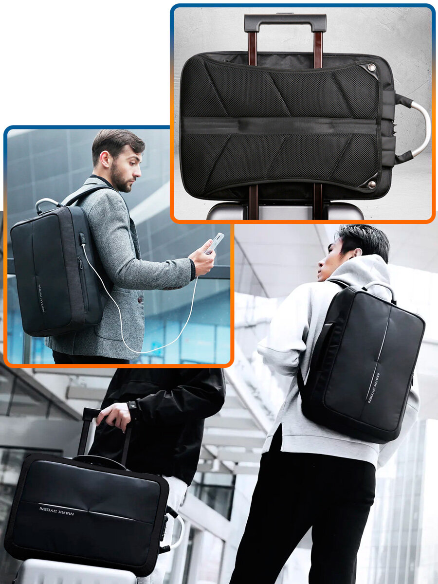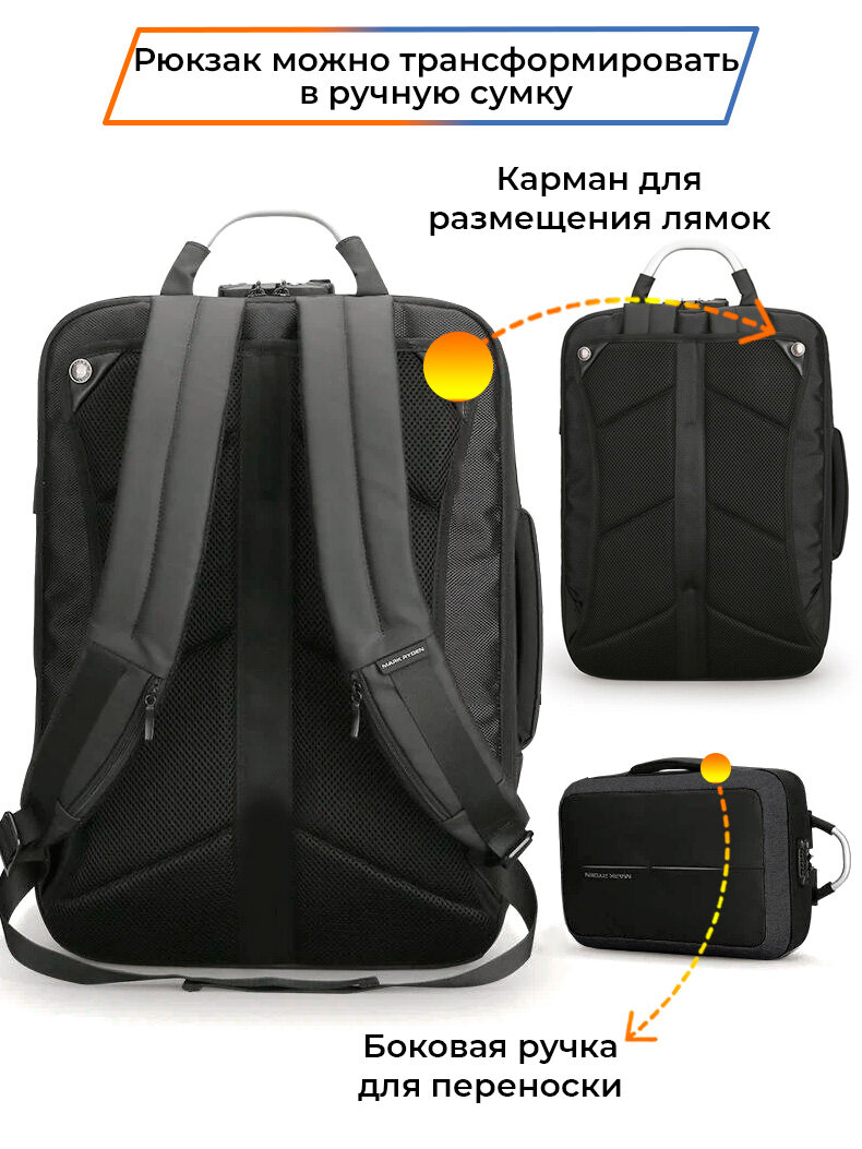 Рюкзак-сумка трансформер мужской городской дорожный 18л для ноутбука 15.6 с кодовым замком Mark Ryden MR6832 Черный водонепроницаемый с USB зарядкой
