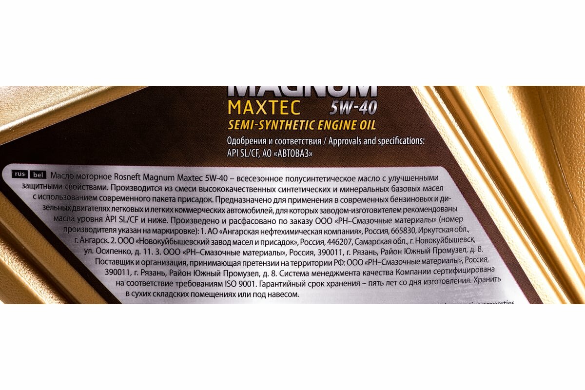 масло Rosneft Magnum Maxtec 5w40 (SL/CF) 4л п/с (увеличение срока службы двигателя)